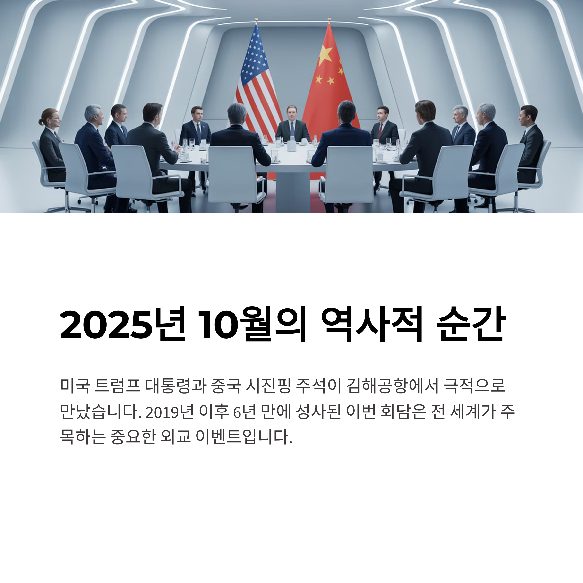 2025년 10월은 세계 외교 무대에서 중요한 사건으로 기록될 예정입니다. 미국 트럼프 대통령과 중국 시진핑 주석이 김해공항에서 극적으로 만난 이번 미중 정상 회담은 2019년 이후 6년 만에 성사된 중요한 만남입니다. 전 세계가 주목하는 이번 회담의 주요 목적은 양국 간의 무역 갈등 완화와 더불어 고조된 긴장을 완화하는 데 있습니다. 두 정상은 관세 문제, 히토류 통제, 글로벌 공급망 안정화와 관련한 논의에 집중하고 있습니다. 특히, 한국과 관련된 무역 협상에서 자국 이익을 보호하려는 태도로 주목받고 있어, 이번 회담이 한국에도 중요한 경제적 영향을 미칠 것으로 보입니다.