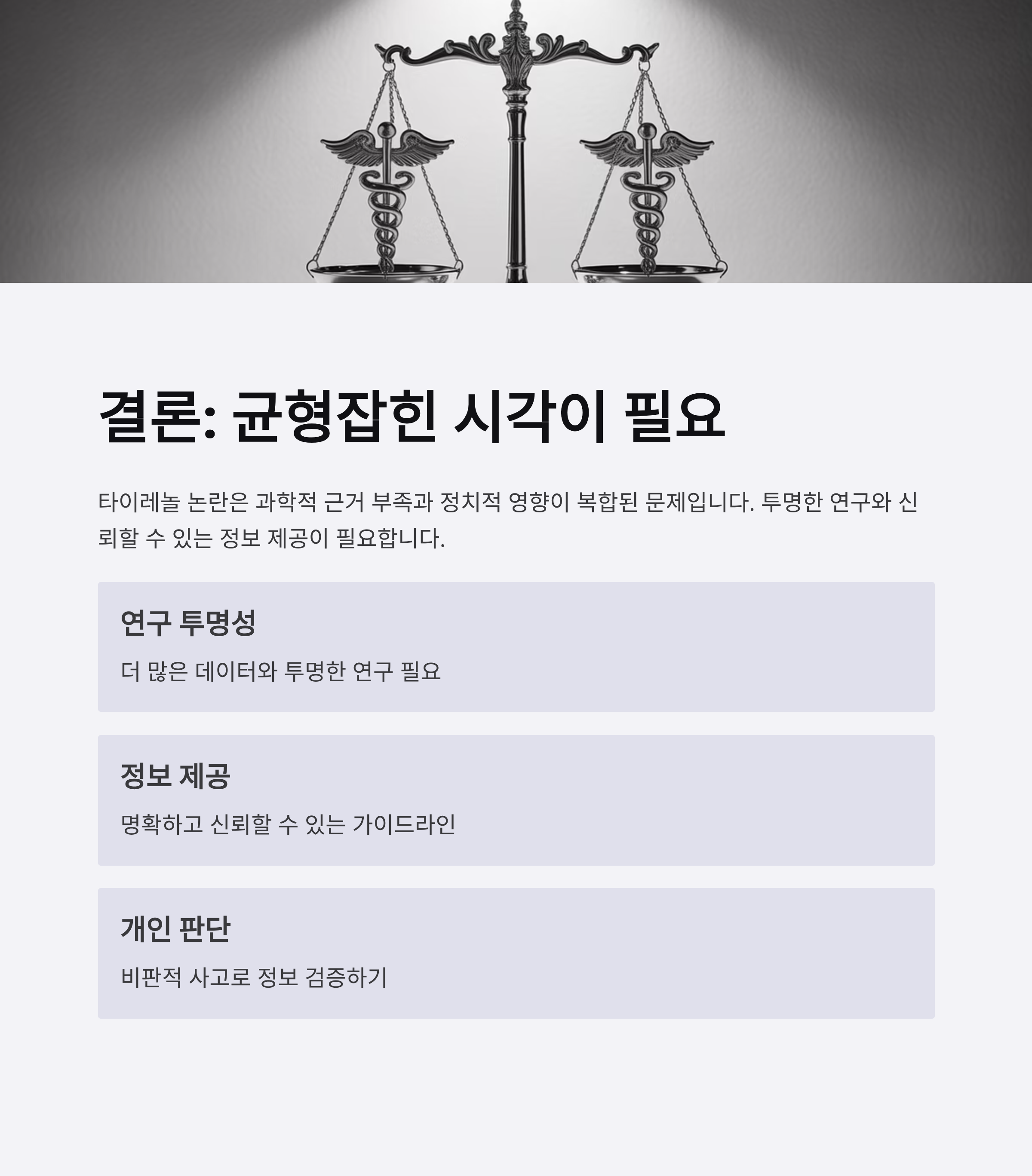 타이레놀 논란은 과학적 근거 부족, 정치적 영향력, 그리고 다양한 이해당사자가 밀집된 복합적인 문제다. 구체적으로 다음과 같은 과제들이 있다. 첫째, 연구 데이터의 투명성과 접근성이 높아져야 한다. 두 번째, 정부 기관과 제약회사는 복용자와 명확하고 신뢰할 수 있는 정보를 제공해야 한다. 마지막으로, 대중은 어떤 정보이든 비판적으로 받아들이고 검증하려는 태도를 가져야 한다. 결론적으로, 타이레놀 논란은 현대 사회에서 건강 이슈와 정보 선택의 중요성을 일깨운다. 정보에 대한 객관적 평가와 판단을 통해, 우리는 더 나은 결정을 내릴 수 있을 것이다.