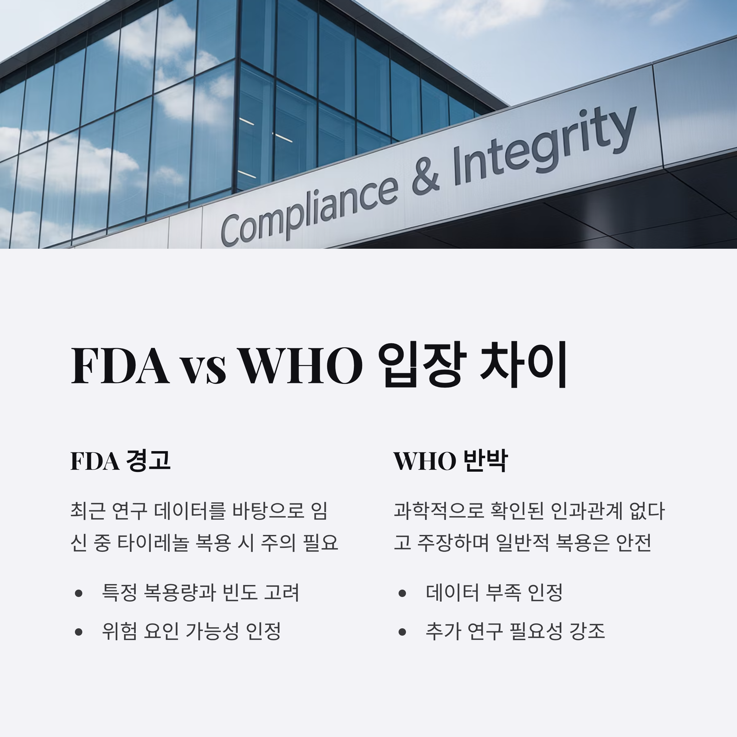 FDA와 WHO의 입장이 다른 것은 연구 데이터의 해석 방식 때문이다. FDA는 최근의 연구들을 바탕으로 임신 중 타이레놀 복용이 일부 위험 요인을 가질 수 있다고 경고했다. 특히, 특정 복용량과 빈도가 영향을 미칠 가능성을 고려 중이다. 반면 WHO는 과학적으로 확인된 인과 관계가 없다고 주장하며, 일반적인 복용 기준에서는 안전하다고 평가했다. 그러나 인체 실험의 어려움으로 인해 데이터가 제한적이라는 문제는 두 기관 모두 인정하고 있다.