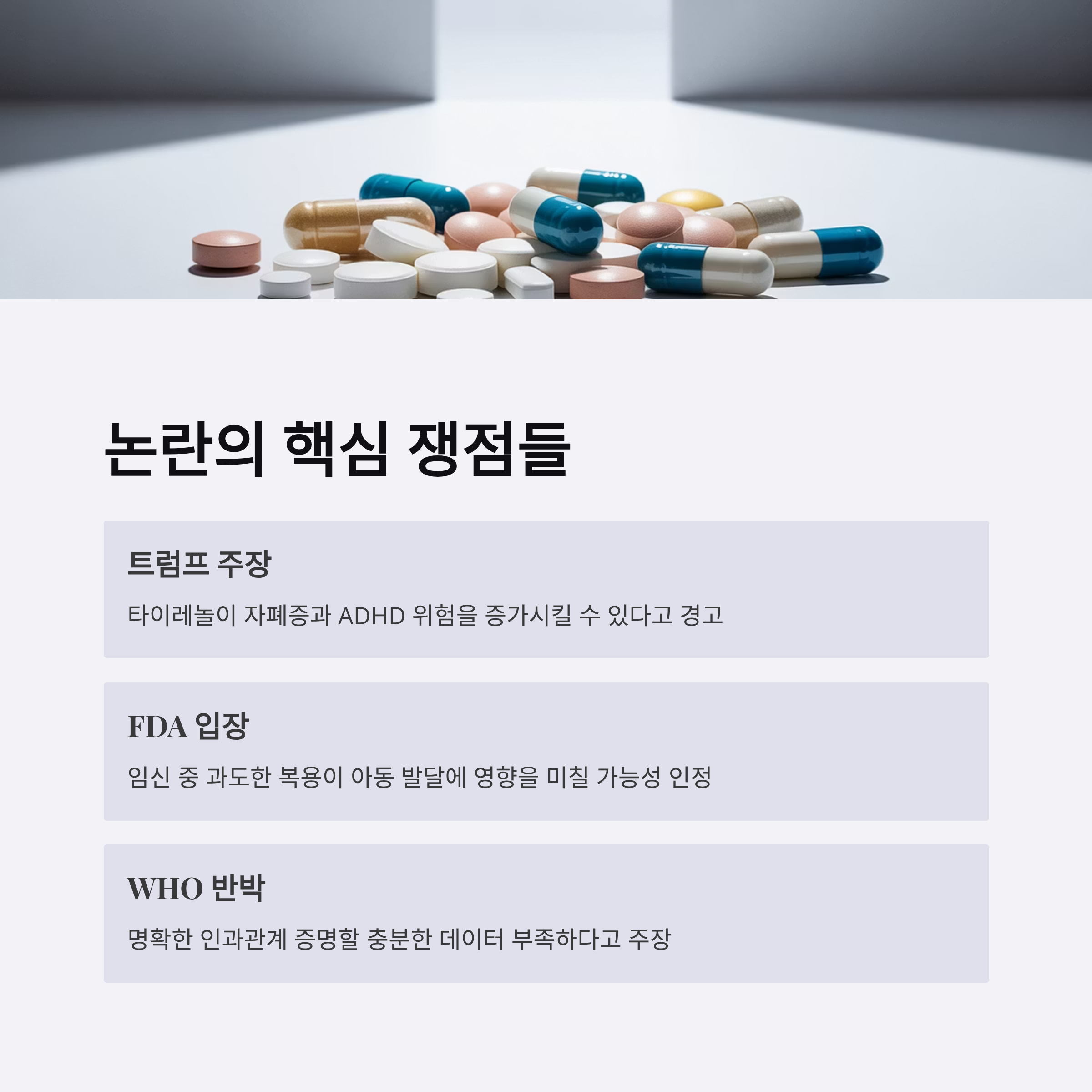타이레놀은 장시간 안전한 진통제로 사용되었지만, 최근 몇 년간 논란이 커져 왔다. 일부 연구에서는 임신 중 타이레놀 복용이 자폐증 및 ADHD와 연관될 가능성을 시사했다. 예를 들어 로이터 통신이 보도한 내용에 따르면, 특정 연구들은 타이레놀이 신경 발달에 영향을 미칠 수 있다는 관찰 결과를 발표했다. 반면 WHO는 현재까지 인과관계를 증명할 만큼 충분한 데이터가 없다는 입장을 유지하고 있다. 타이레놀 제조 업체 역시 해당 연구들에 대해 조심스러운 입장을 밝히며, 임산부 복용 시에는 의료 전문가의 상담이 반드시 필요하다는 점을 강조했다. 이와 같은 상반된 의견은 대중의 혼란을 가중시키고 있다.