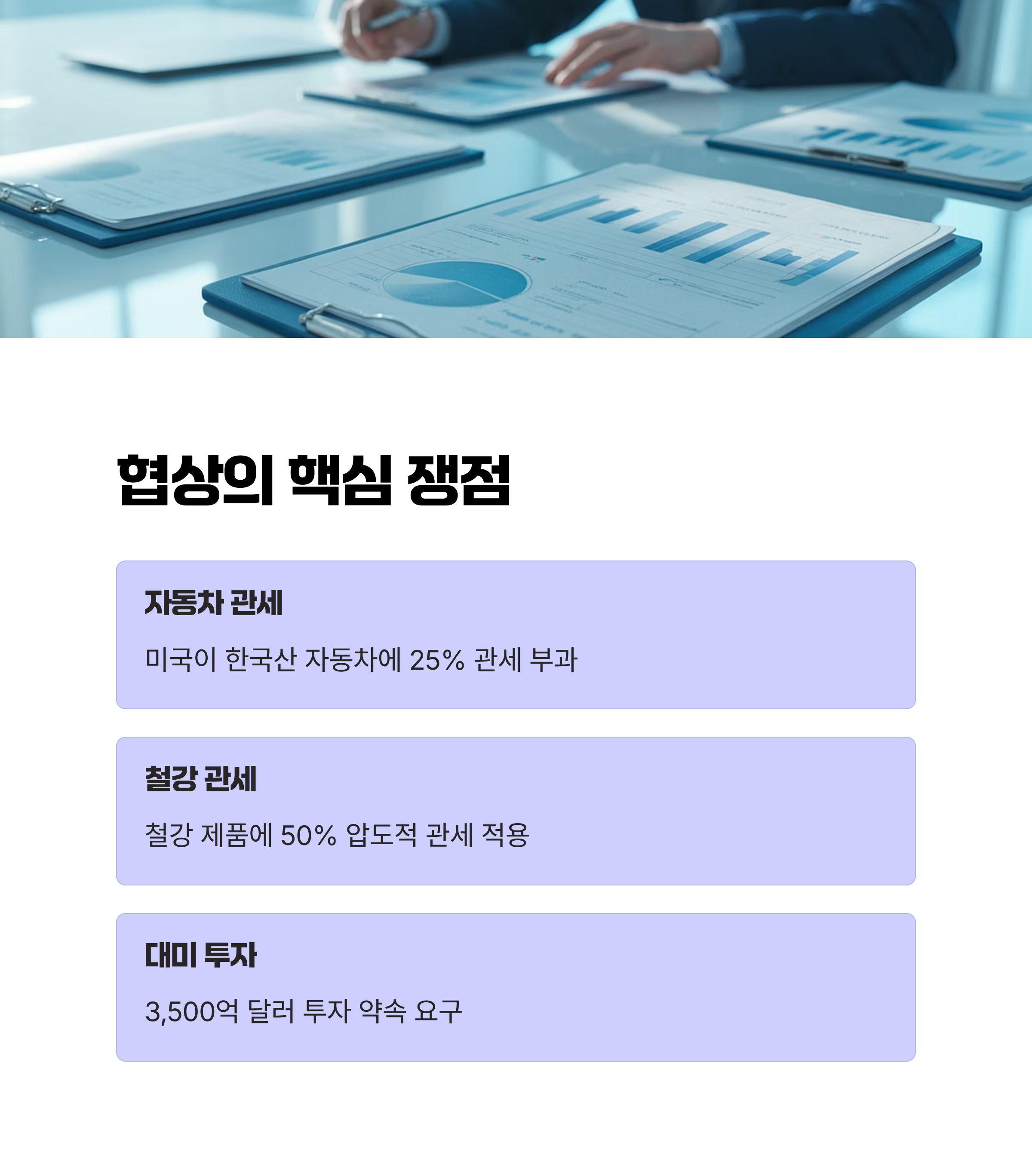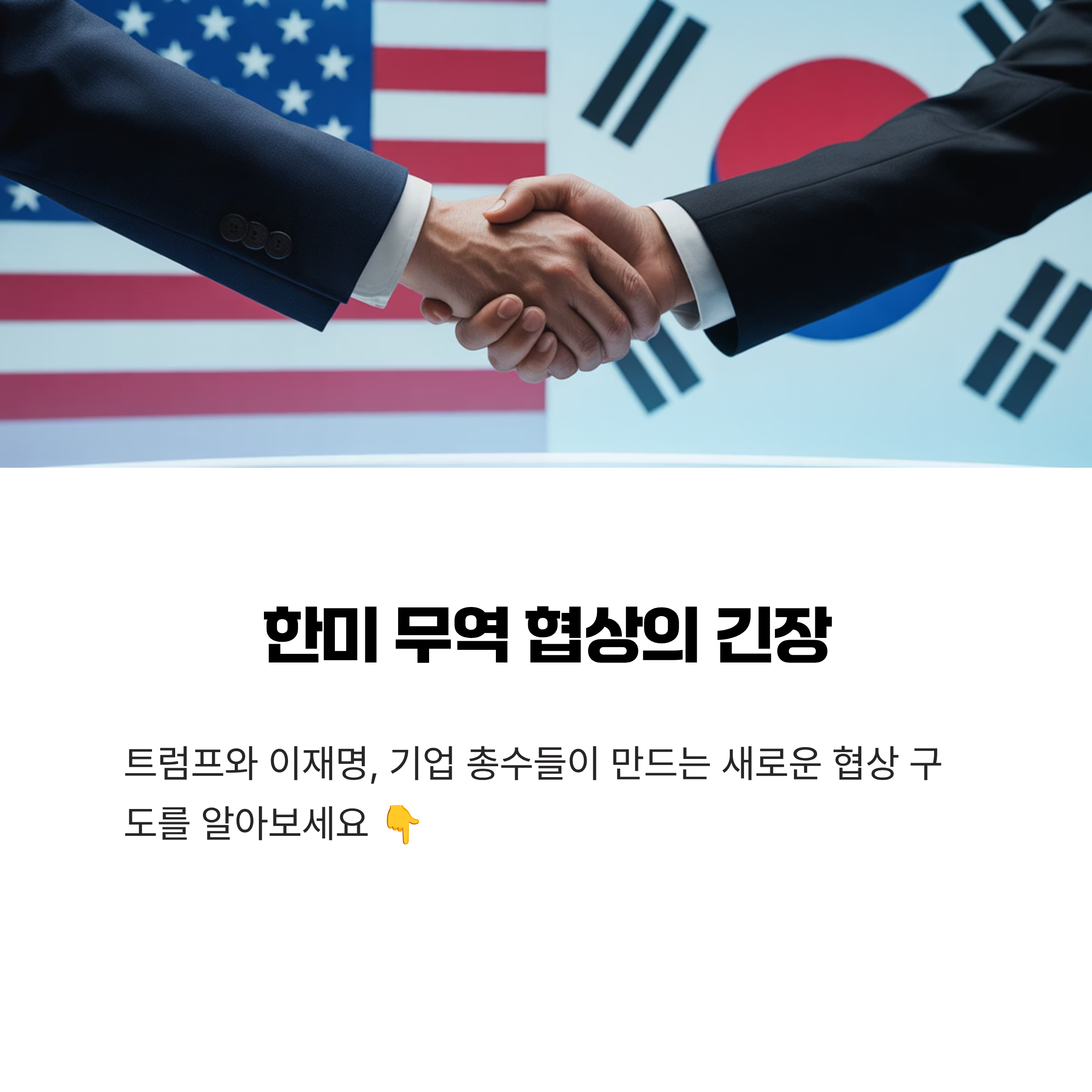 - 최근 한미 무역 협상은 자동차와 철강 산업 관세 및 대미 투자 조율이 주요 이슈로 떠올랐습니다.