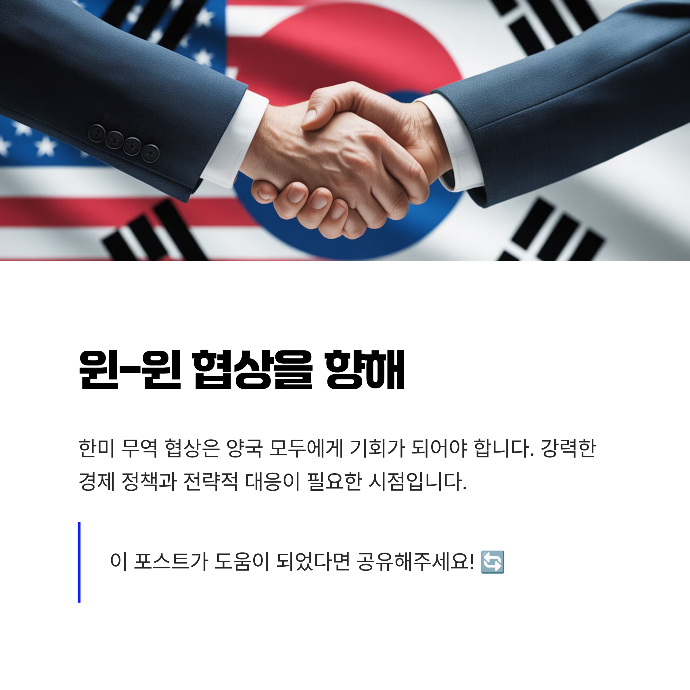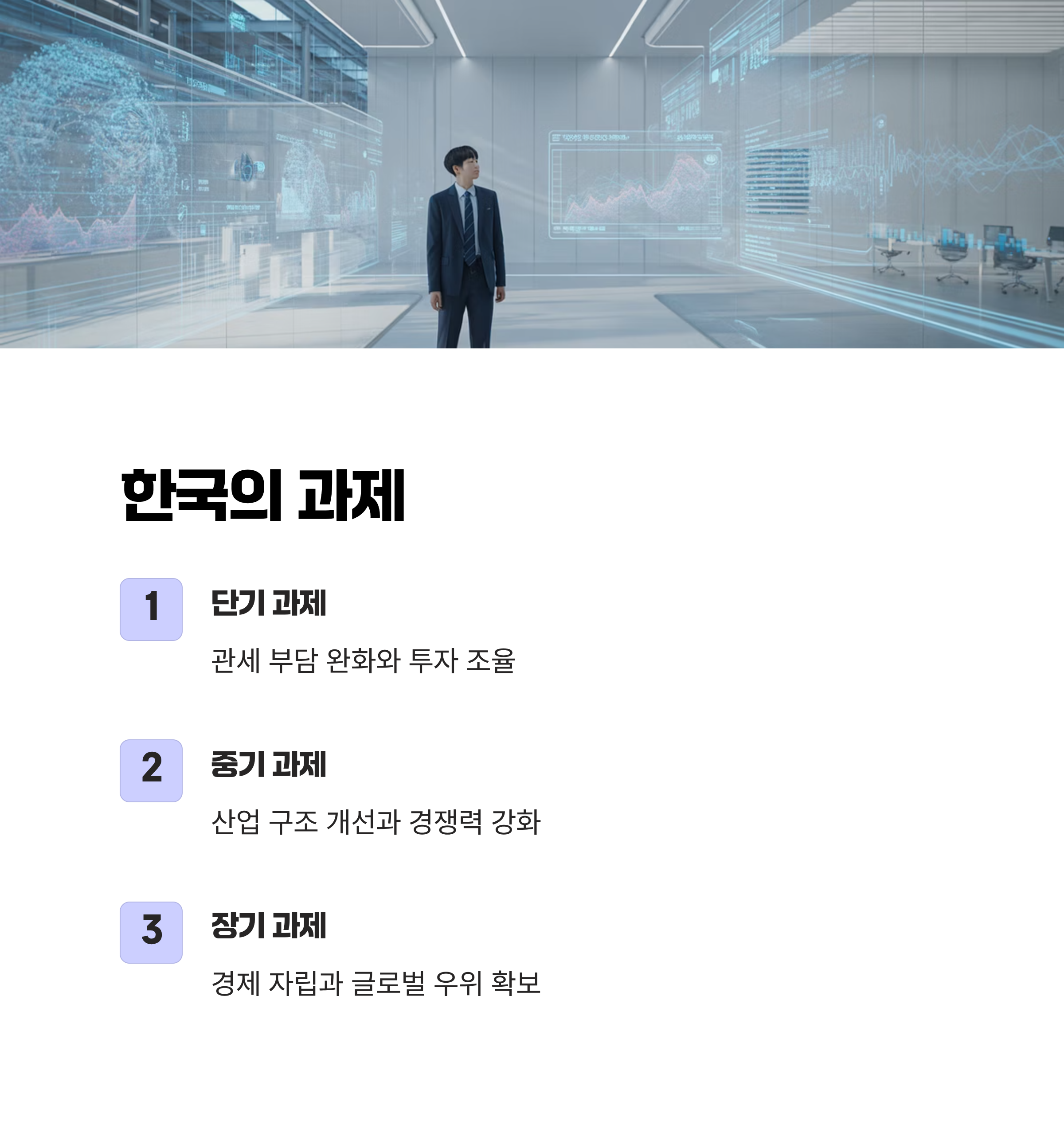 한국은 이 협상에서 단순히 현안을 해결하는 수준을 넘어, 보다 장기적인 경제 자립과 글로벌 시장에서의 경쟁 우위를 확보해야 할 과제를 안고 있습니다. 이를 위해 더욱 강력한 경제 정책 전략과 산업 구조 개선이 필요합니다. 궁극적으로 이번 협상은 양국이 윈-윈할 수 있는 방향으로 결론 나야 할 것입니다.