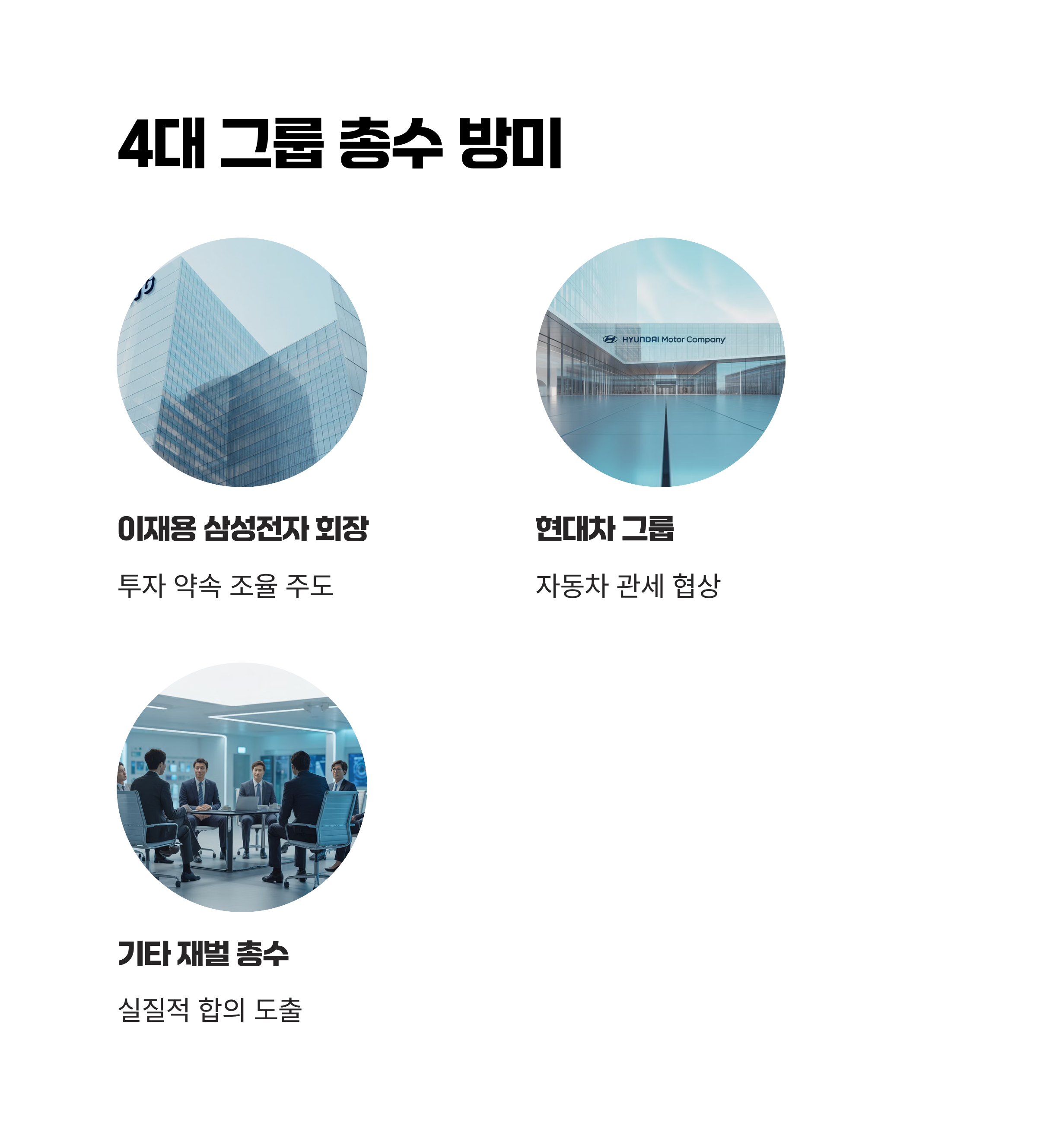 이번 협상의 또 다른 핵심은 삼성전자 이재용 회장을 비롯한 4대 그룹 총수들이 대미 투자 약속을 조율하기 위해 미국을 방문한 점입니다. 이들의 미국 방문은 단순한 외교적 제스처가 아니라, 투자와 무역 문제를 직접 해결하기 위한 실질적인 행보로 평가되고 있습니다. 트럼프 전 대통령과의 골프 모임 및 비공식적인 접촉은 미국 측과의 신뢰 구축 및 합의점을 찾는 데 기여하고 있습니다.