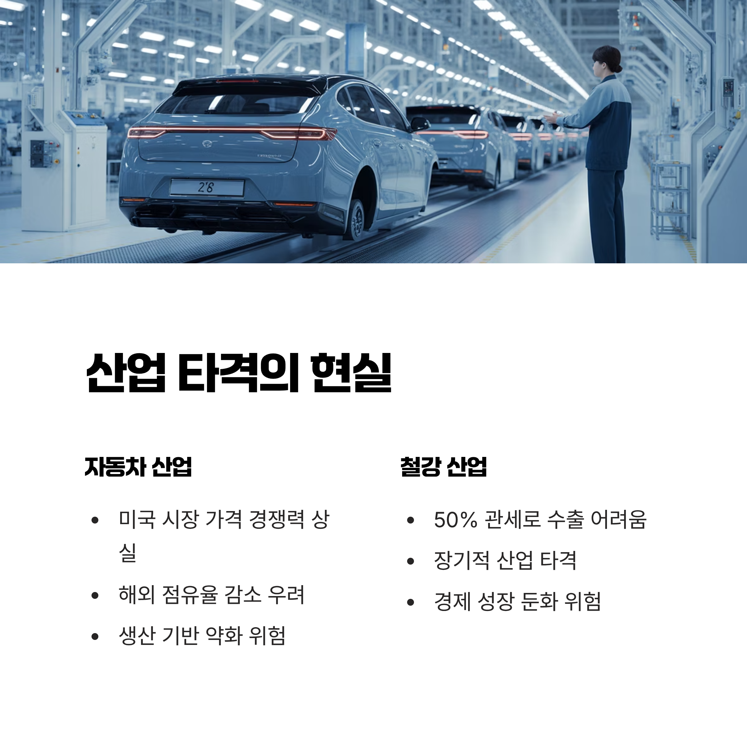 A. 한국 자동차 및 철강산업은 관세 상승으로 인해 미국 시장 내 경쟁력을 잃고 있습니다. 이는 경제 전체 성장 둔화로 이어질 위험을 가지고 있습니다. |