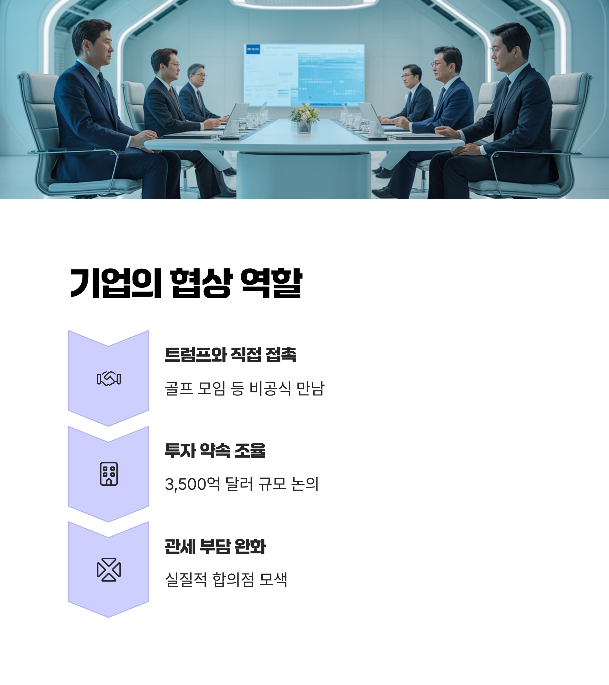 - 한국 측 대기업 대표들이 미국을 방문해 합의안을 조율하며 주요한 역할을 하고 있습니다.
