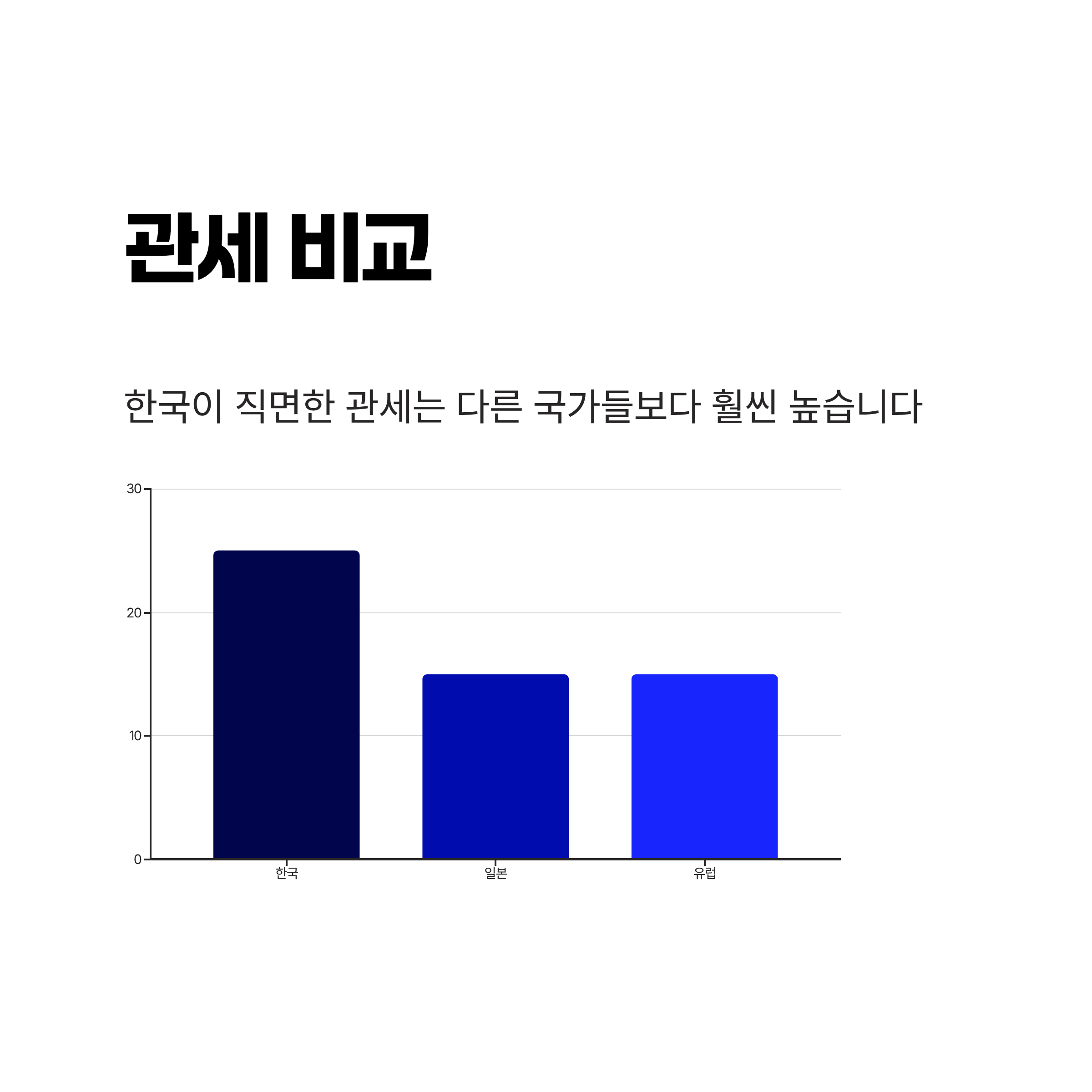 한미 무역 협상에서 가장 큰 난제는 미국이 부과하는 높은 관세입니다. 미국은 한국산 자동차에 25%, 철강 제품에 50%에 달하는 압도적인 관세를 적용하고 있는데, 이는 일본과 유럽의 관세와 비교했을 때 평균 15% 수준보다 한층 더 높은 편입니다. 이로 인해 한국의 자동차 및 철강 수출 기업들이 미국 시장에서 가격 경쟁력을 잃고 있으며, 장기적으로 한국 산업에 타격을 주고 있습니다. 특히, 자동차 업계에서는 해외 시장 점유율 감소와 함께 생산 기반 약화 우려가 커지고 있습니다.