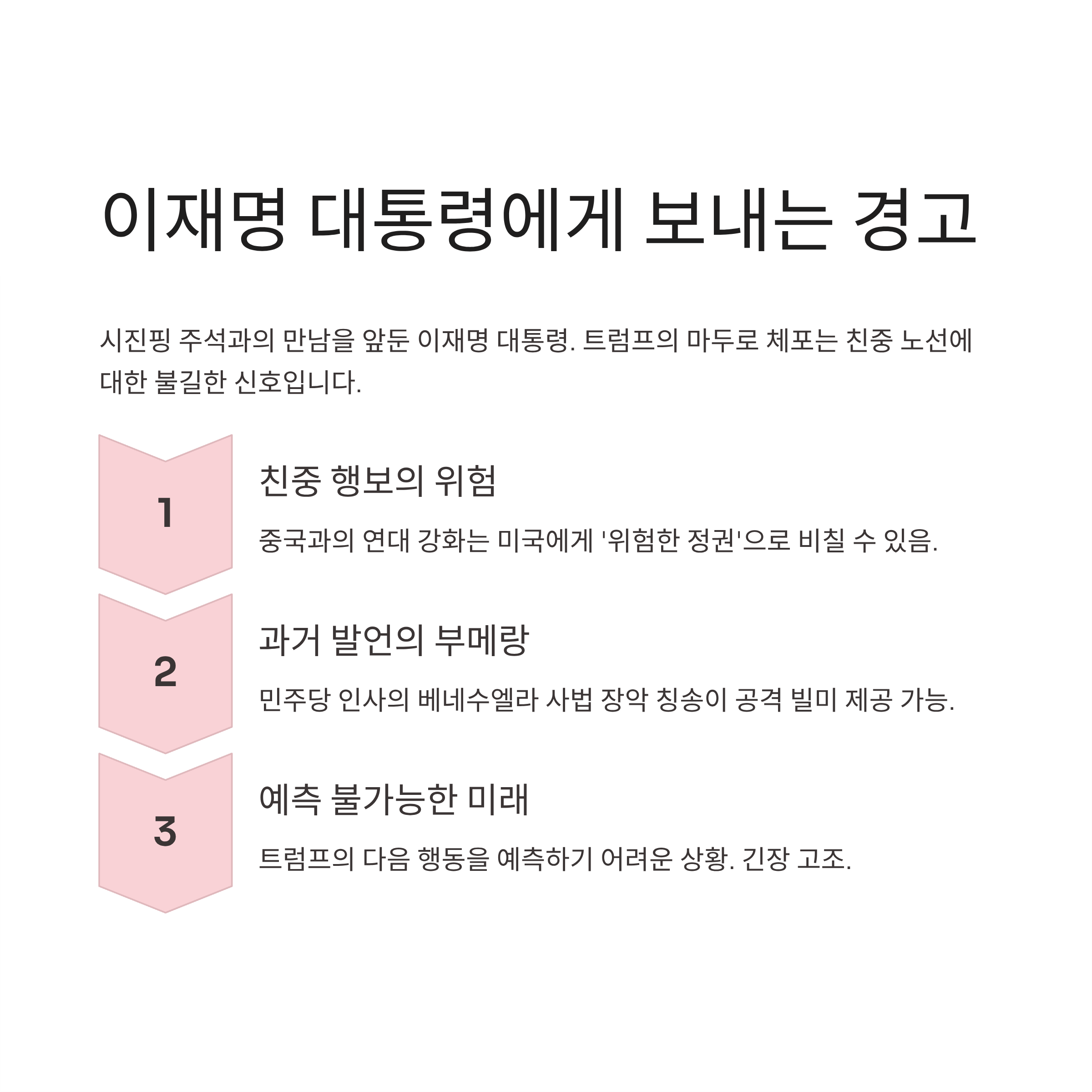 | A. 트럼프 행정부가 친중 성향의 지도자를 직접적인 군사 행동으로 제거한 선례를 남겼기 때문입니다. 이재명 대통령의 친중 행보와 과거 민주당 인사들의 베네수엘라 체제 옹호 발언 등이 미국에게 공격의 빌미를 제공할 수 있다는 우려가 나옵니다. |