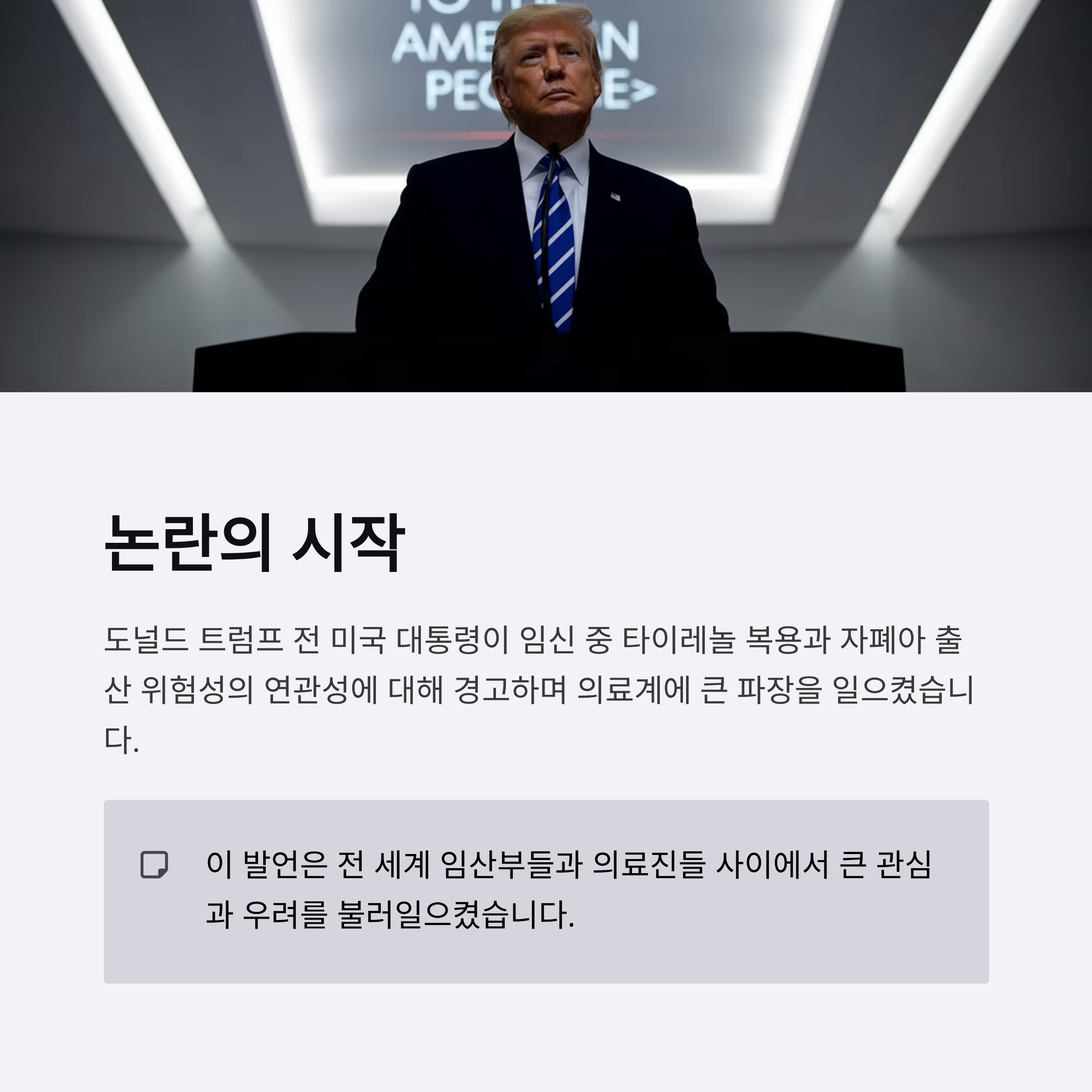 도널드 트럼프 전 미국 대통령의 발언은 타이레놀 복용과 자폐증의 연관성에 대한 검증되지 않은 주장을 포함하고 있습니다. WHO, EMA, 그리고 주요 연구기관의 검토 결과는 이 주장이 과학적 근거 부족에 기인한 것이며, 임산부의 약물 선택이 치료 효과를 유지하며 태아와 모체의 건강에 미치는 긍정적 영향을 고려해야 함을 재확인합니다.