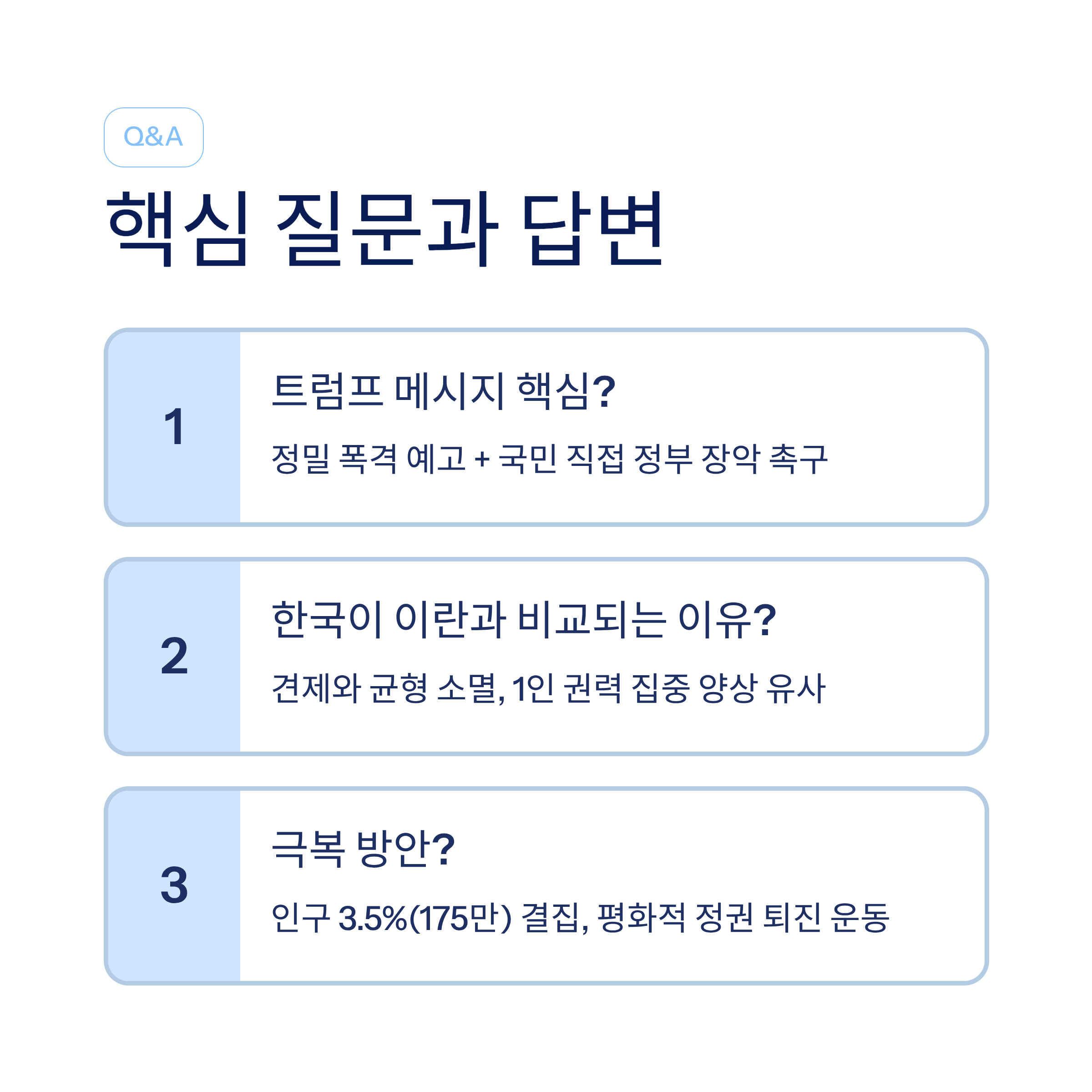 | Q2. 현재 한국 상황이 이란이나 베네수엘라와 비교되는 이유는 무엇인가요? |