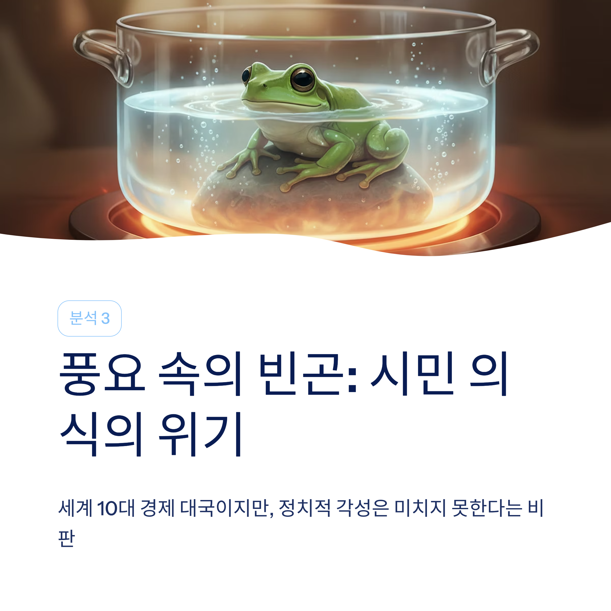 선거를 통해 합법을 가장한 독재 체제로 진입했다는 체제 전복 위기감이 확산되며, 국민들은 '냄비 속 개구리' 신세를 지적합니다.
