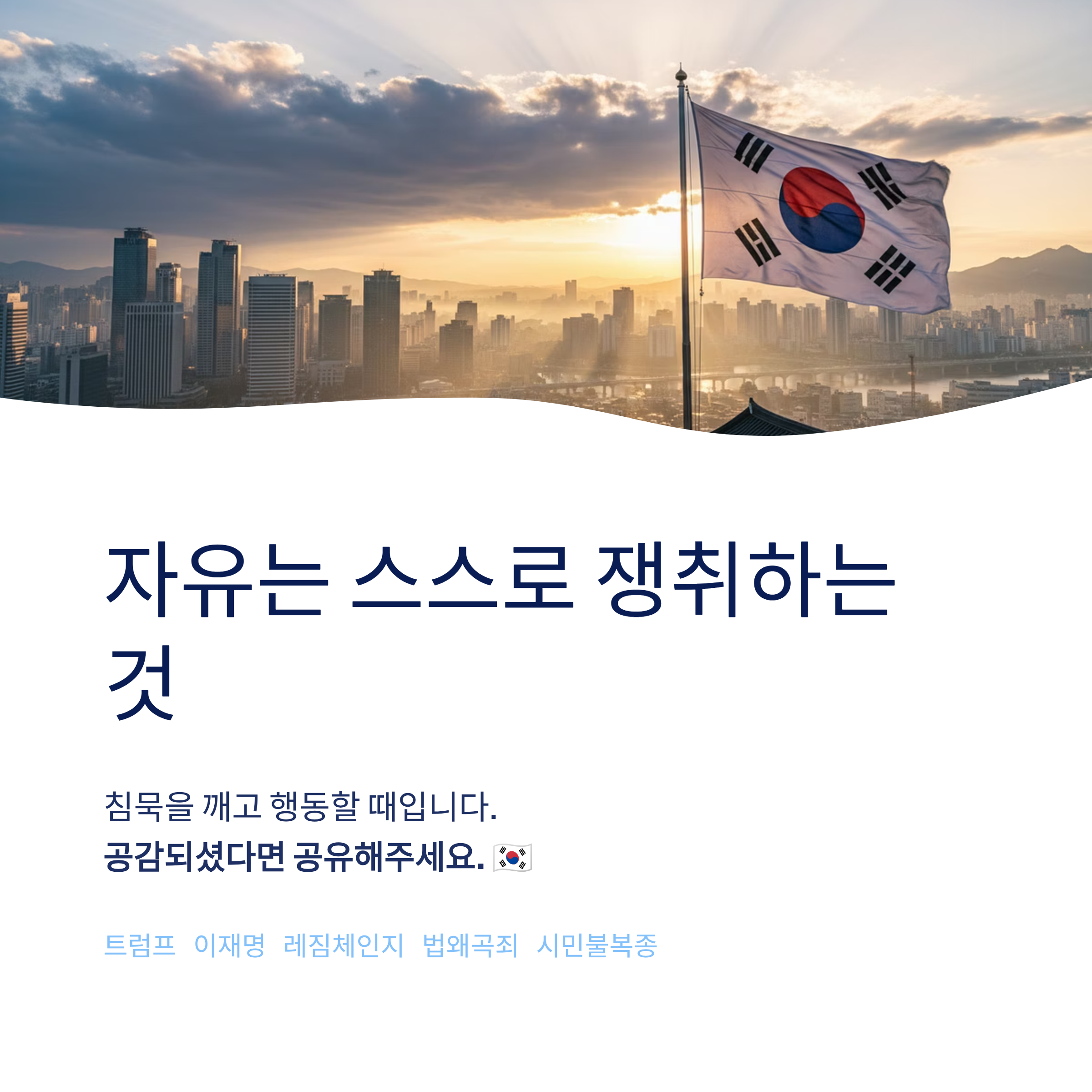트럼프 대통령의 이란 메시지가 한국 사회에 주는 울림은 역설적이게도 대한민국의 비극적인 현실을 방증합니다. 현재 대한민국은 이재명 정권 하에서 입법, 사법, 언론이 장악되어 자유민주주의의 기본 원칙이 훼손된 상태입니다. 국민들은 윤석열 전 대통령 탄압과 이재명 대통령의 법적 면죄부화 과정을 목격하며 절망감을 느끼고 있습니다. 그러나 외부의 힘에만 의존하는 것은 근본적인 해결책이 될 수 없습니다. 트럼프의 메시지가 시사하는 바는 결국 "너희의 운명은 너희가 개척하라"는 것입니다. 미국이 압도적인 힘으로 환경을 조성해 줄 수는 있어도, 결국 사회를 재건하는 주체는 그 나라의 국민이어야 합니다. 지금 필요한 것은 막연한 외세의 구원 기대가 아니라, 175만 명 이상의 깨어있는 시민들이 조직적으로 연대하여 무너진 헌정 질서를 바로잡는 행동입니다. 침묵하는 다수는 독재의 토양이 될 뿐입니다. 지금이 바로 대한민국 국민들이 스스로의 자유를 위해 행동해야 할 마지막 골든타임입니다.