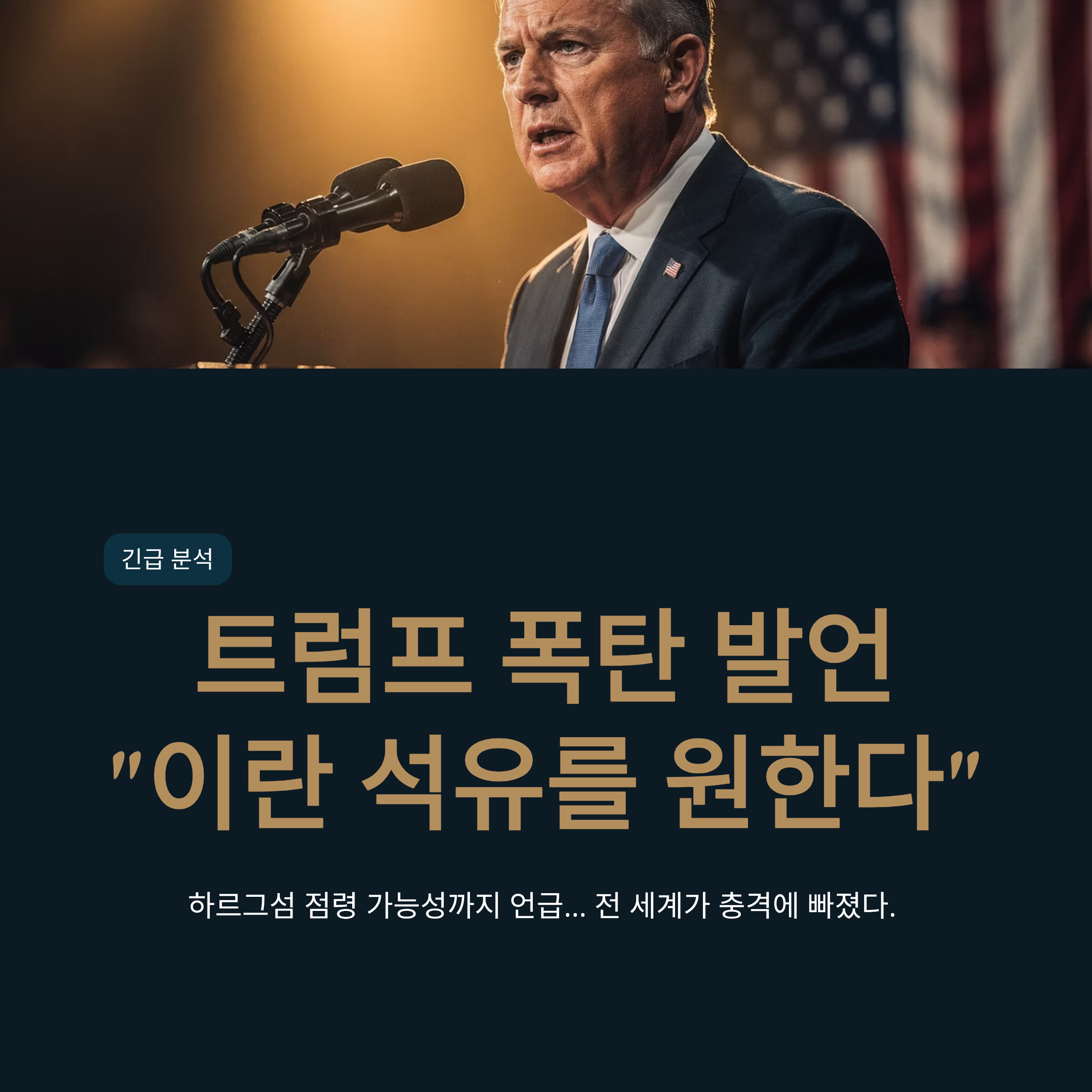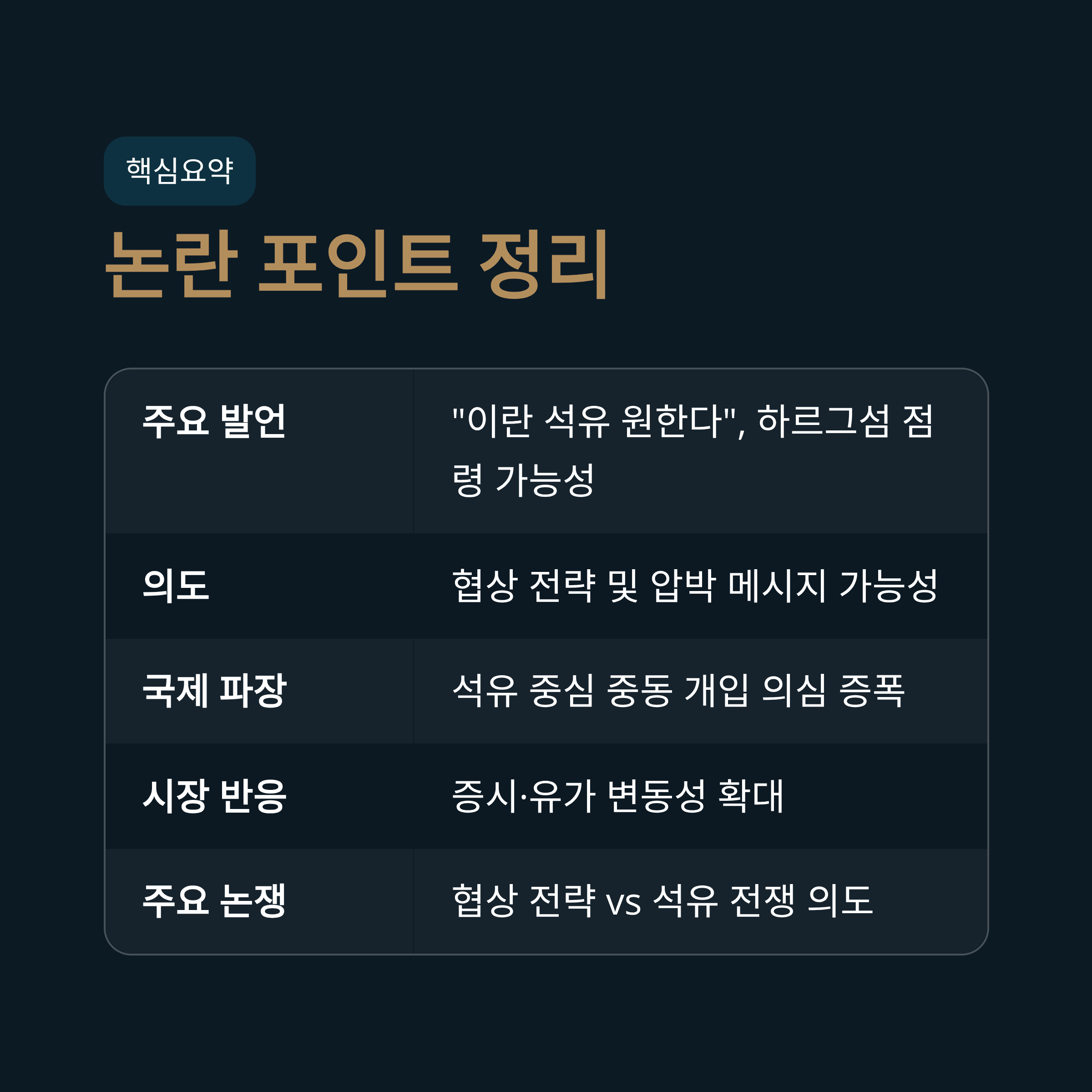 | 주요 발언 | "미국은 이란의 석유를 원한다", "하르그섬 점령 가능성" |