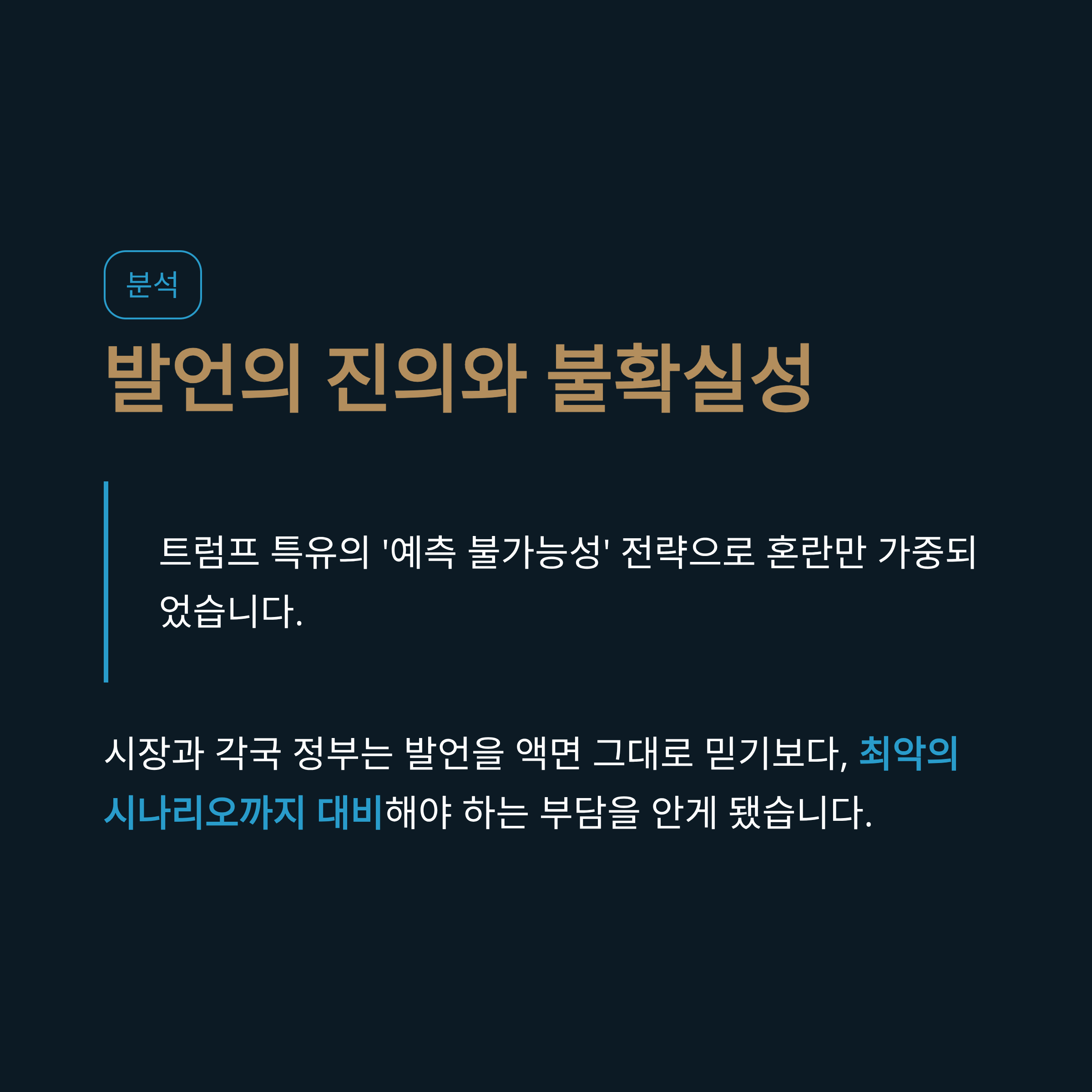 트럼프 발언의 가장 큰 문제는 그 신뢰성입니다. 전 세계는 이번 발언의 명확성을 찾으려 했지만, 트럼프 특유의 '예측 불가능성' 전략에 따라 혼란만 가중되었습니다. 이러한 의도된 불확실성은 단기적으로는 협상력을 높일 수 있으나, 장기적으로는 국제 사회의 신뢰를 잃게 만드는 요인입니다. 결국 시장과 각국 정부는 그의 발언을 액면 그대로 믿기보다, 최악의 시나리오까지 대비해야 하는 부담을 안게 됩니다.