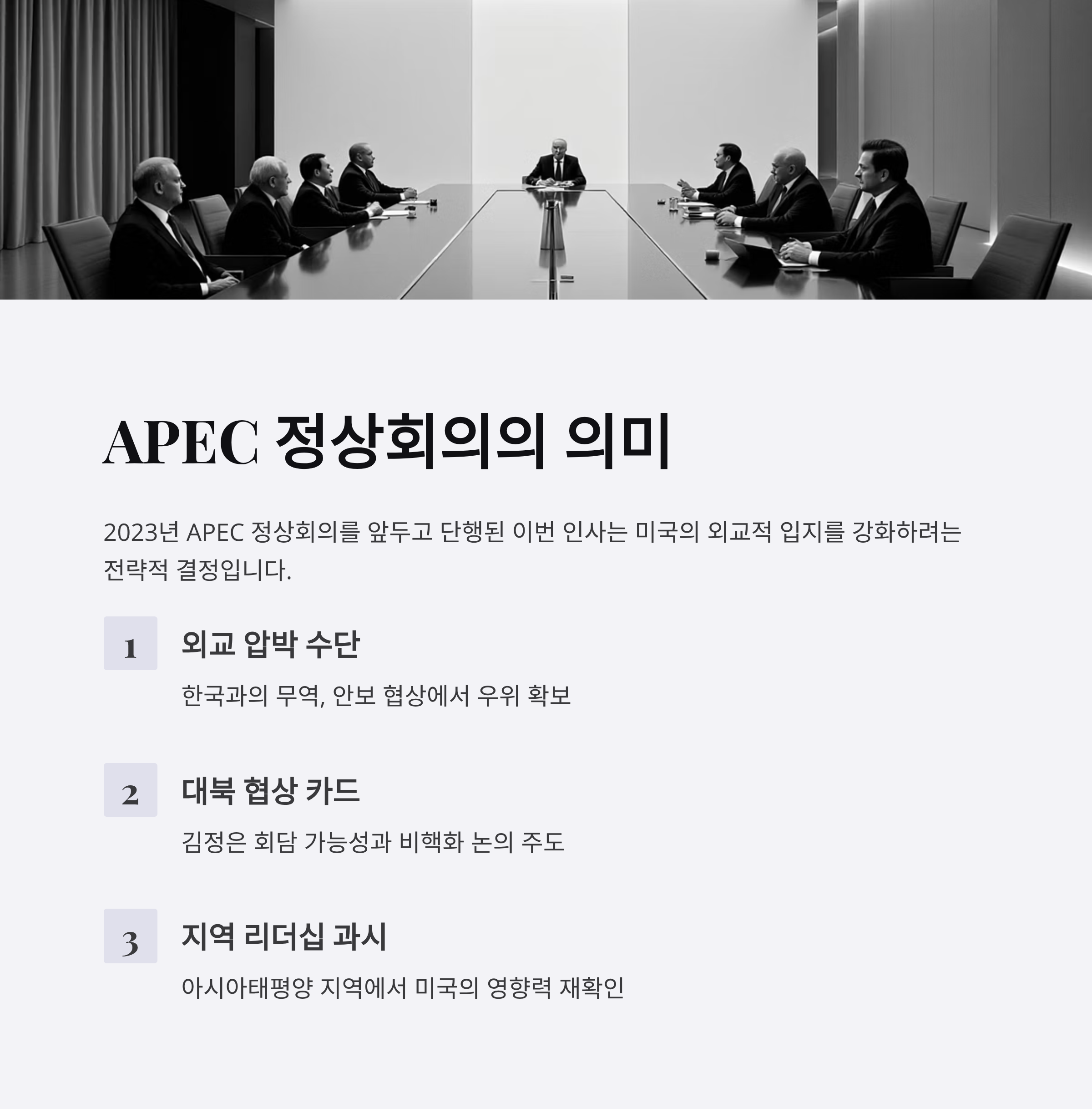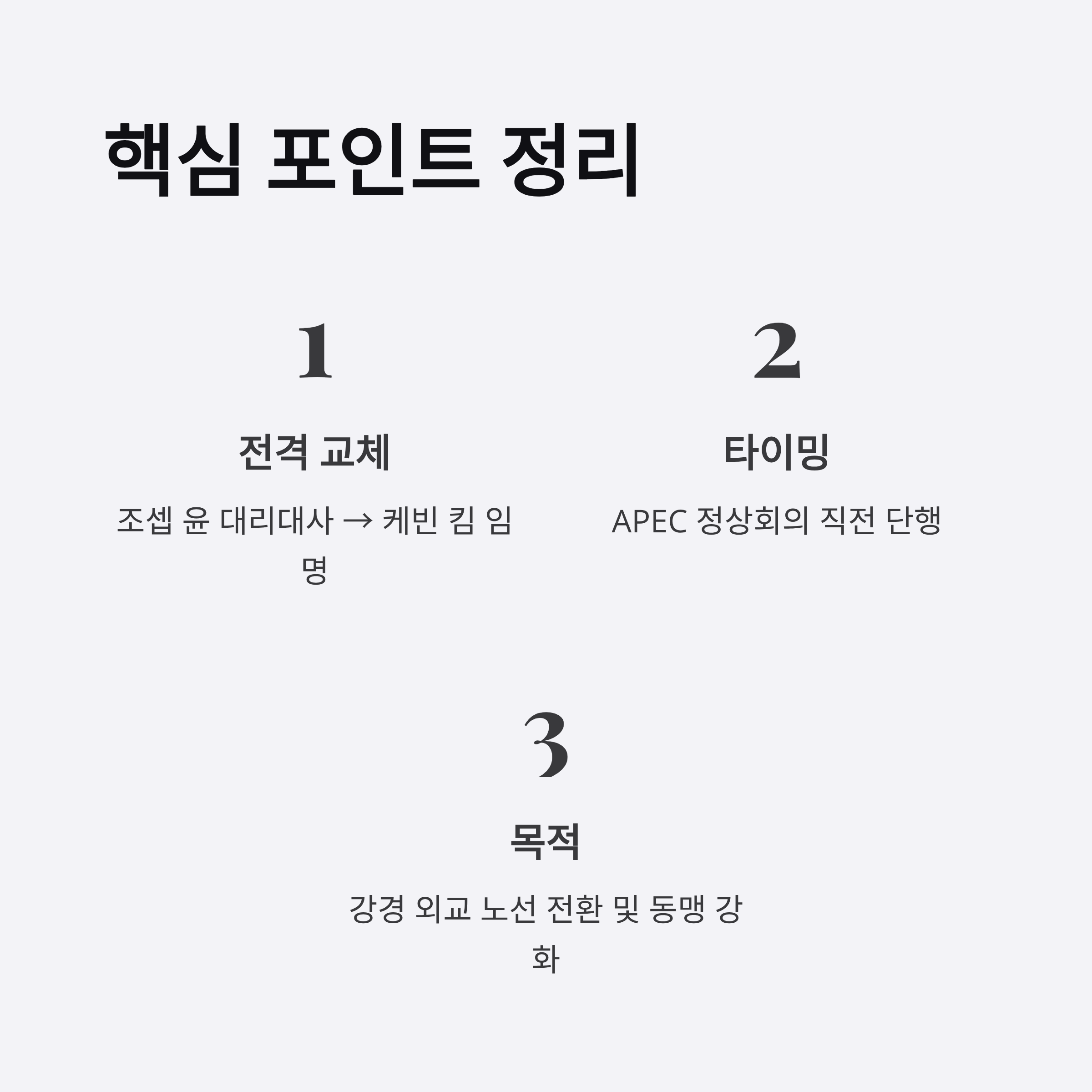 2023년 APEC 정상회의를 앞둔 시점에서 이와 같은 인사 교체는 외교적 압박 수단으로 보입니다. 트럼프 행정부는 한국 정부와의 무역, 안보 및 경제적 관계를 강화하면서 동시에 압박하는 전략을 취할 가능성이 큽니다. 특히, 이번 교체는 김정은과의 회담 가능성 및 대북 압력을 조율하는 데 있어 중요한 역할을 수행할 것으로 예상됩니다.