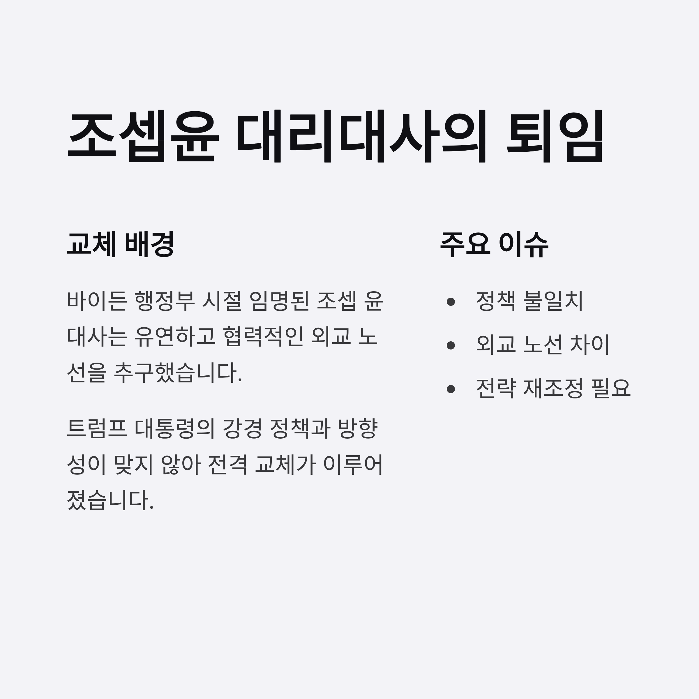 4. 교체의 주요 배경은 조셉 윤 전 대리 대사의 외교 노선과 트럼프 정책의 방향 불일치로 판단.