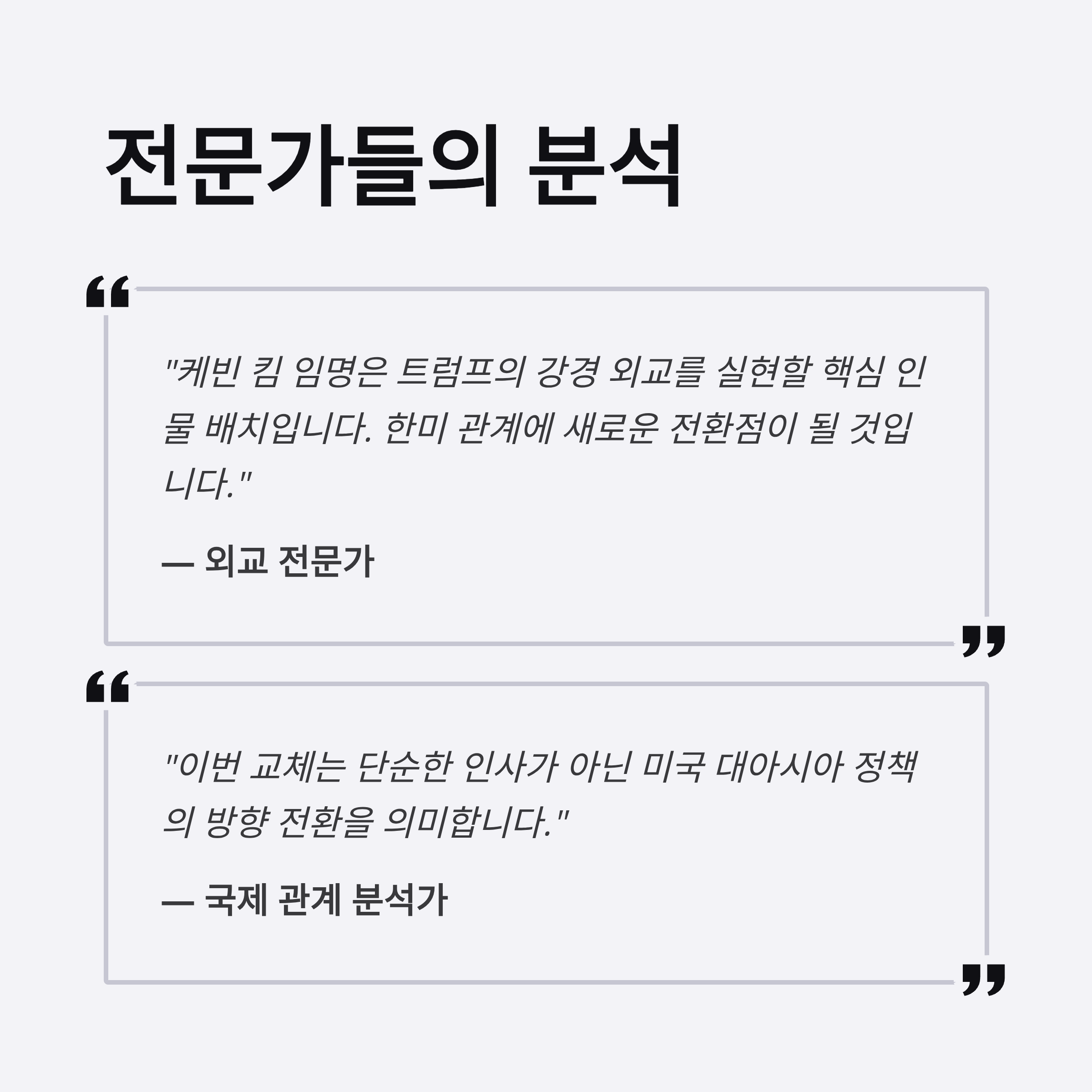 2. 새로 임명된 케빈 킴은 한미 관계 및 대북 협상 전문가로 알려져 있으며, 동아시아 외교에서 강한 영향력을 가질 것으로 분석.