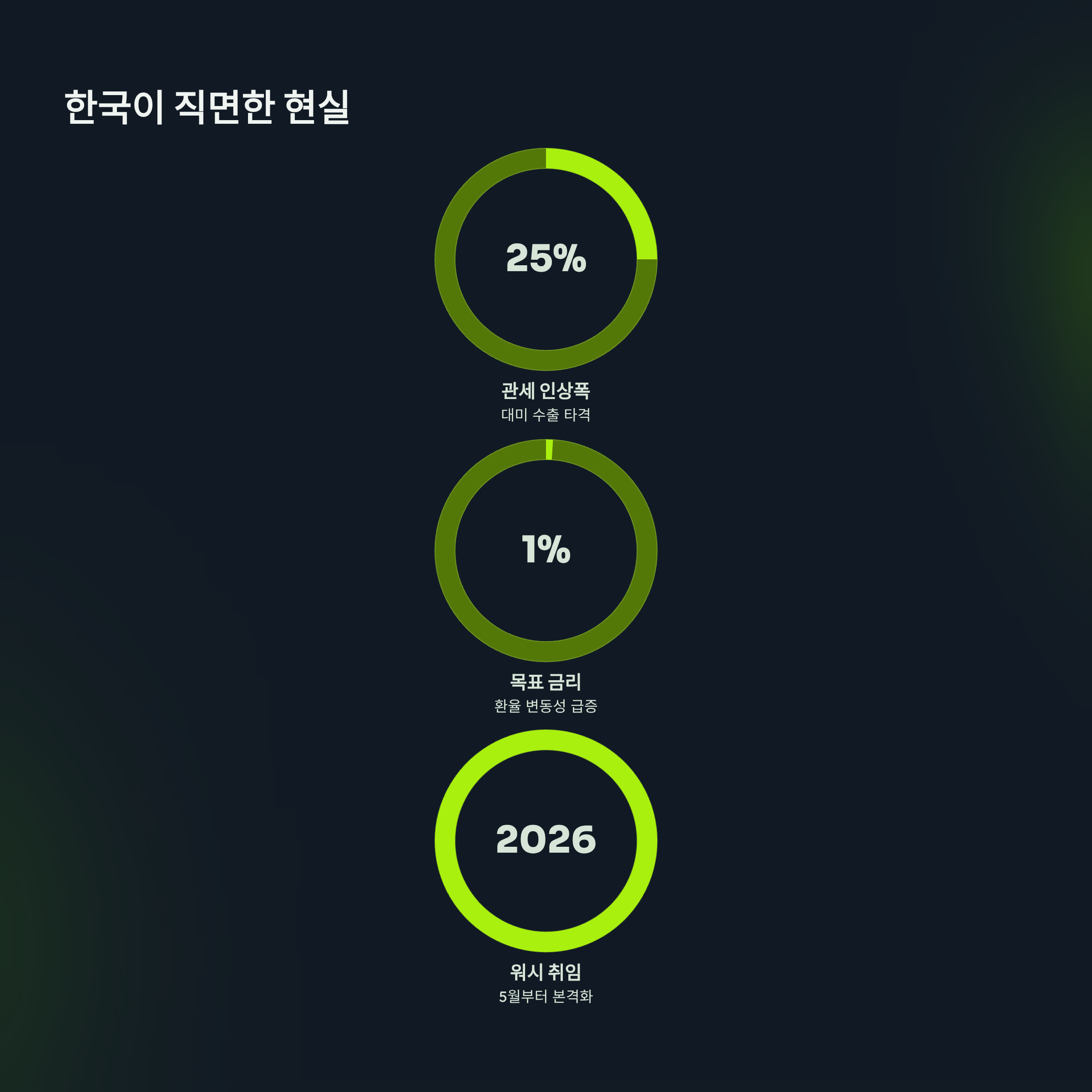 | 대(對)한국 통상 압박 | 자동차, 목재 등 관세 15% → 25% 인상. 환율 관찰 대상국 지정. |