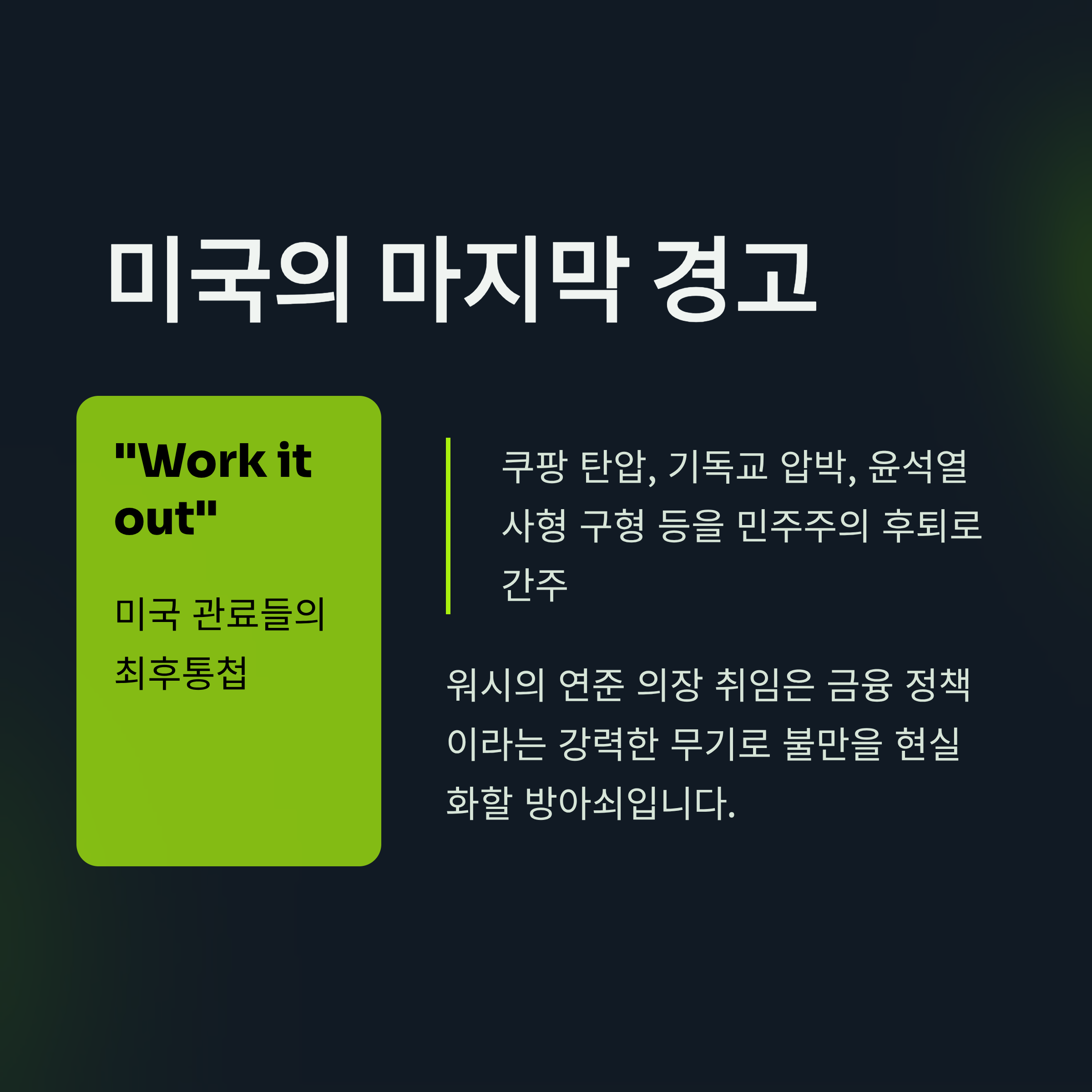 미국은 이미 한국에 대한 통상 압박 수위를 높이고 있습니다. 자동차, 목재, 의약품에 대한 관세를 기존 15%에서 25%로 인상한 것은 한국의 대미 무역 흑자와 기업 규제에 대한 불만이 반영된 결과입니다. 텍스트에 따르면 미국은 쿠팡 탄압뿐만 아니라 기독교계에 대한 압박, 윤석열 전 대통령에 대한 사형 구형 등 한국의 내부 정치 상황을 인권 및 민주주의 후퇴로 보고 있습니다. 진 커미스(가칭) 등 미국 관료들이 "잘 협의해보자(Work it out)"라고 말한 것은 사실상 마지막 경고입니다. 워시의 연준 의장 취임은 이러한 미국의 불만을 금융 정책이라는 강력한 무기로 현실화할 수 있는 '방아쇠'가 될 수 있습니다. 이재명 정부는 지금 '우물 안의 개구리'처럼 국내 정치용 기업 때리기에 몰두하다가, 글로벌 금융 패권의 거대한 역풍을 맞을 위기에 처해 있습니다.