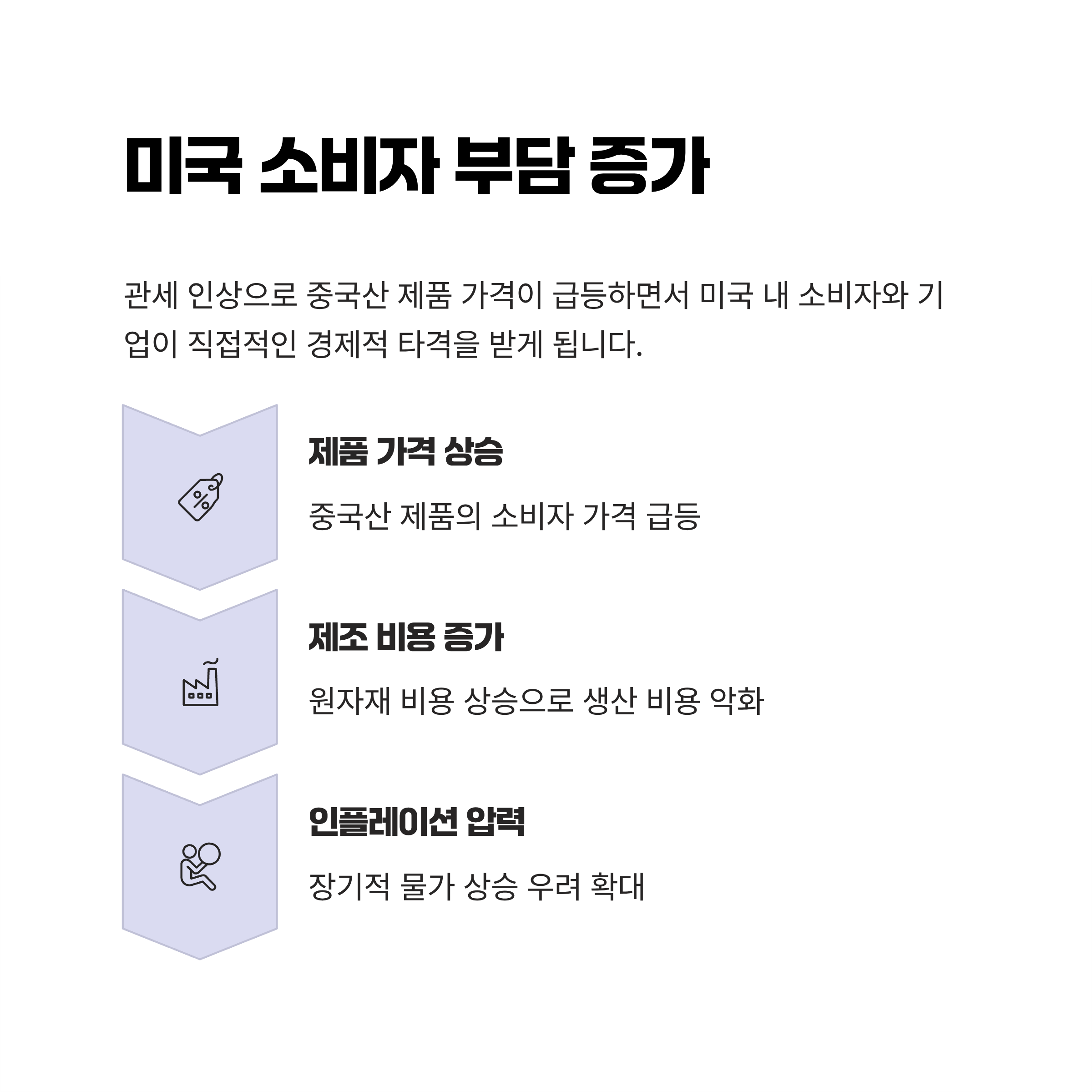 A. 추가 관세는 미국 내 소비자 부담을 크게 증가시키고, 중국과의 무역 관계를 악화시킬 가능성이 높습니다. 이는 생산 비용 증가와 글로벌 공급망 변화로 이어질 수 있습니다. |