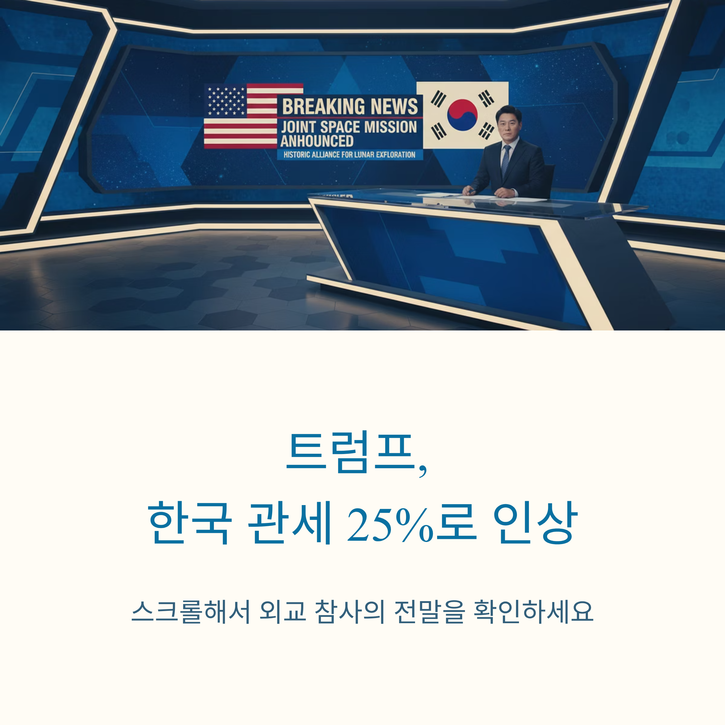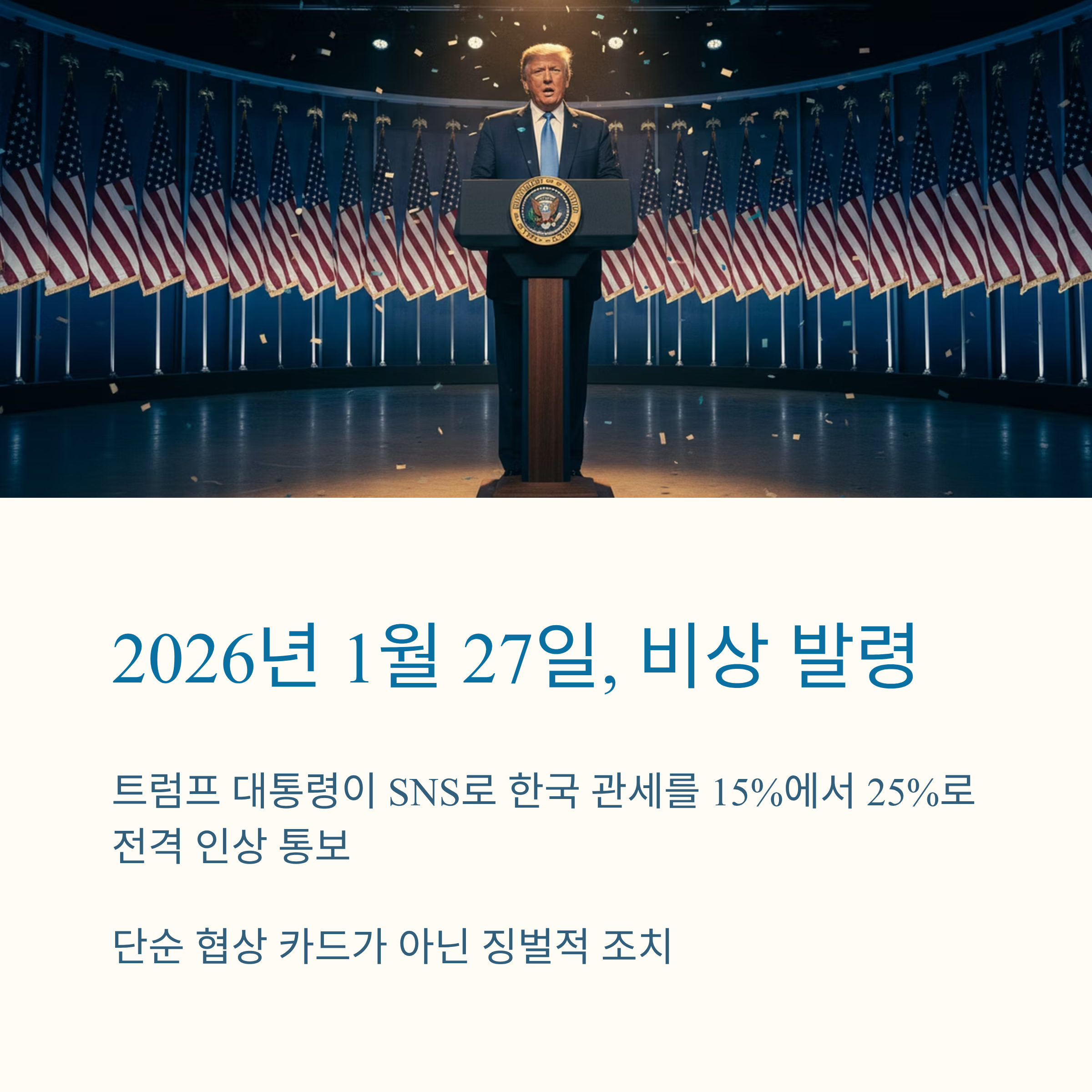 | 상황 발생 | 2026년 1월 27일, 트럼프 대통령이 한국산 수입품(자동차, 목재, 의약품 등)에 대한 관세를 15%에서 25%로 상향 조정한다고 SNS를 통해 공식 발표함. |