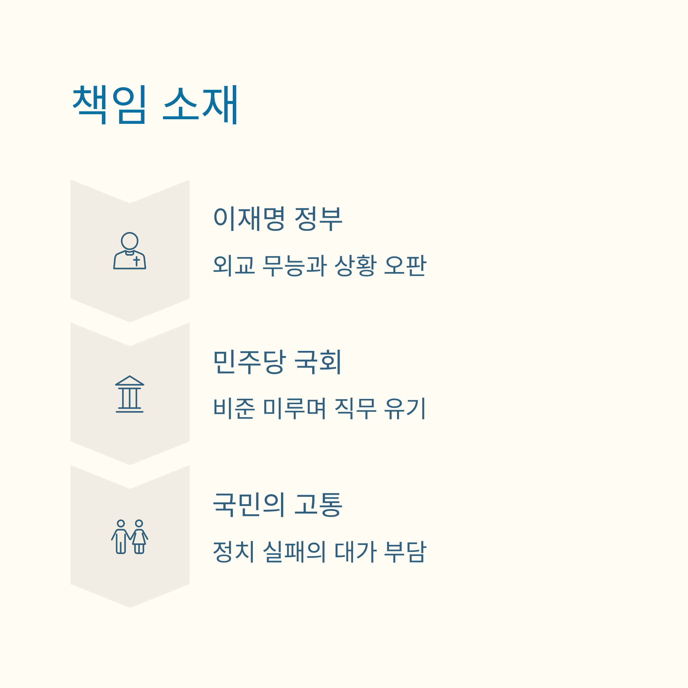 | 책임 소재 | 국가 간 약속을 이행하지 않고 정쟁에 몰두한 이재명 정부와 민주당 중심의 국회에 대한 책임론 대두. |