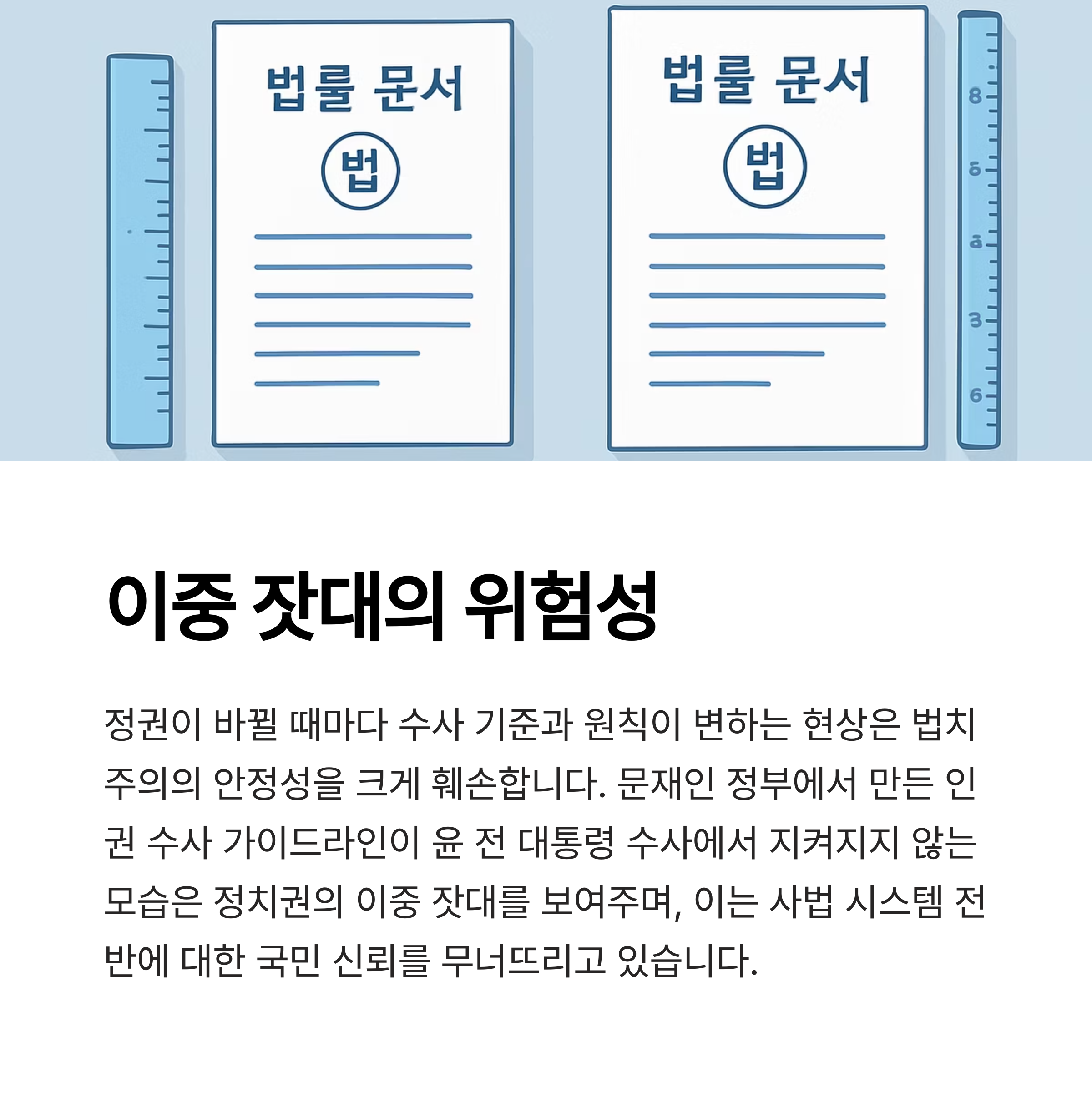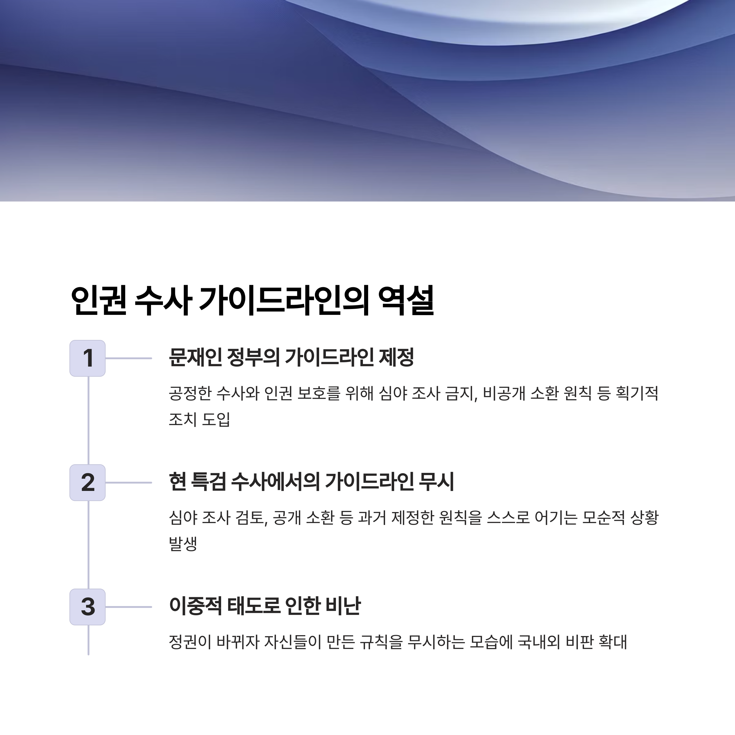 과거 문재인 정부의 인권 수사 가이드라인이 이번 수사에서 거의 준수되지 않고 있는 점이 논란을 키우고 있습니다.