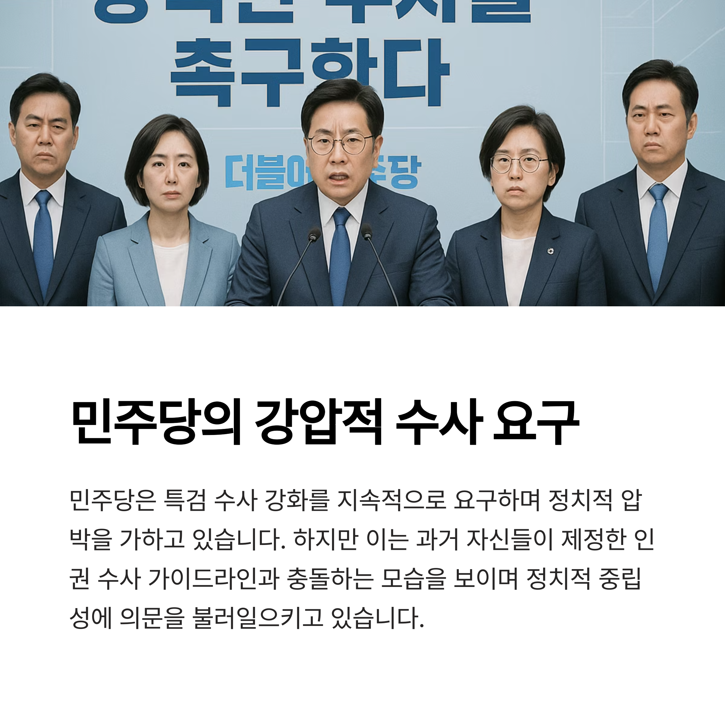 주요 관점은 특검팀의 수사 준비 부족과 민주당의 강압적 수사 요청에 대한 비판입니다.