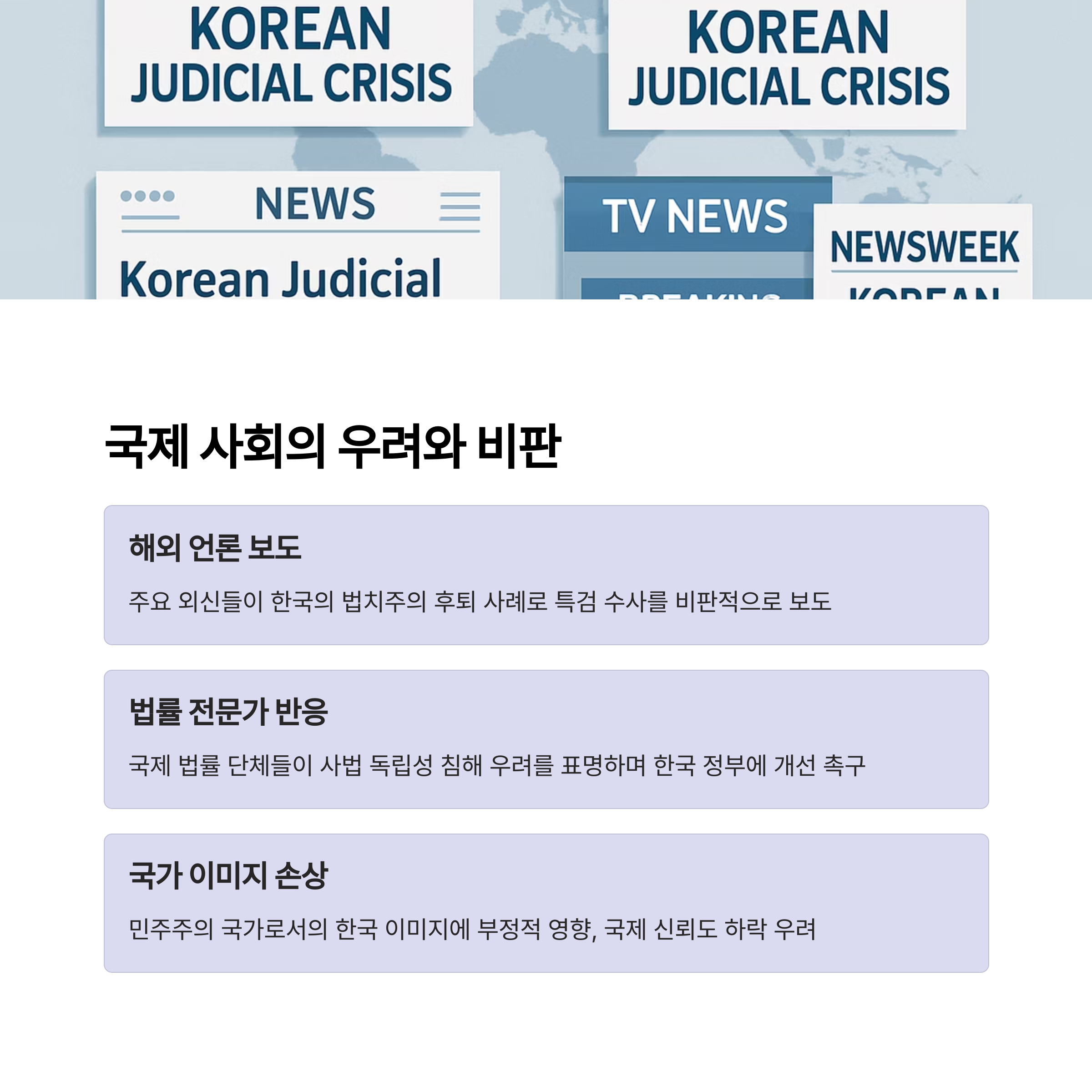 특검에서 특정 판결에 대해 내란 혐의를 적용한 사례는 법조계에 큰 충격을 주었습니다. 이는 헌법상 독립된 판사의 판단을 정치적 수단으로 공격하는 행위로 간주될 위험이 큽니다. 사법 독립성이 흔들리면 법 체계의 공정성과 정당성에 큰 타격을 입을 수밖에 없습니다. 특히 이러한 접근은 국제 사회에서도 우려를 낳고 있으며, 해외 유수 언론들은 이를 법치주의의 후퇴로 보고 보도하고 있습니다. 이를 통해 한국은 사법 시스템의 신뢰도를 다시 재고해야 할 필요성이 대두되고 있습니다.