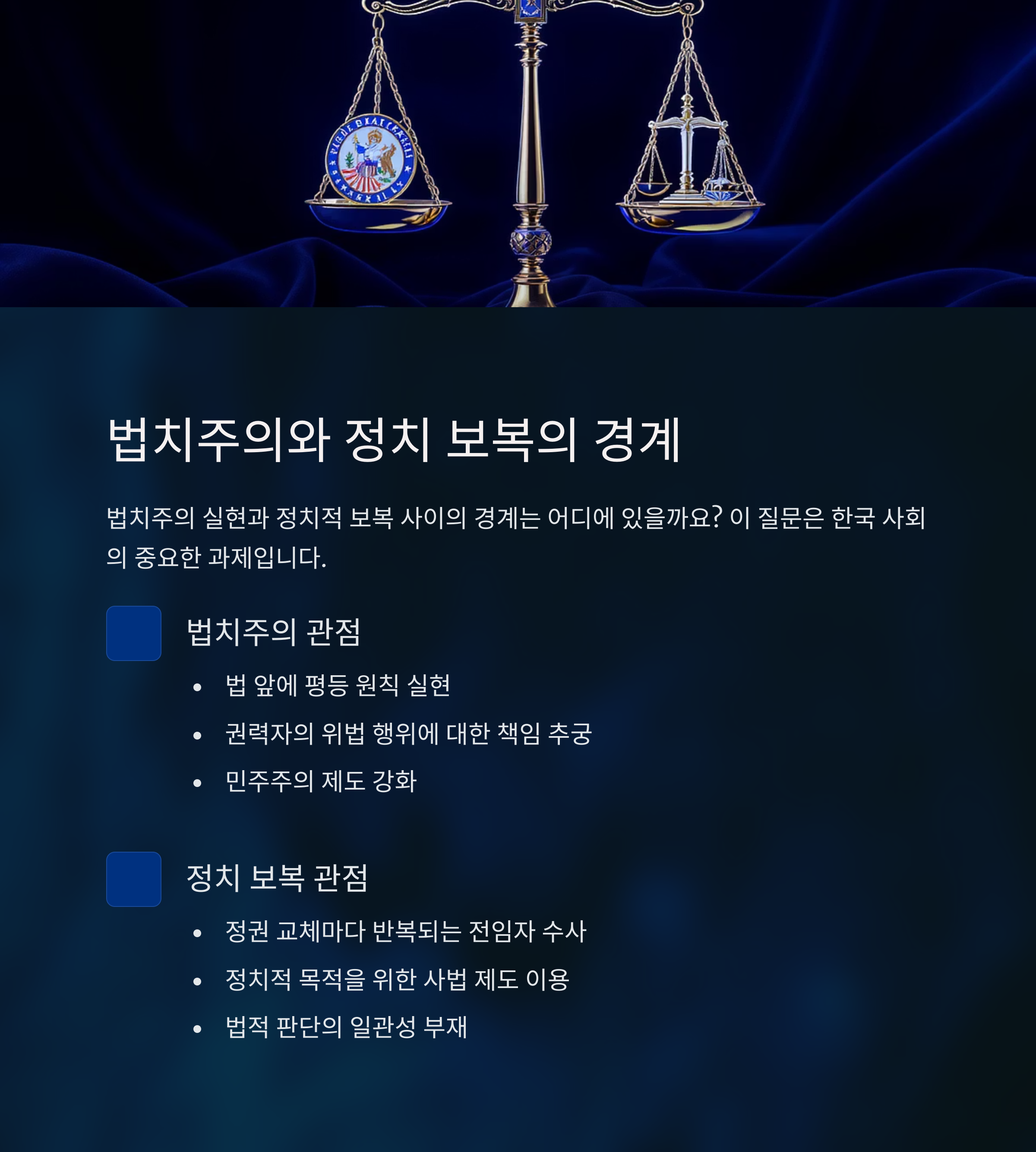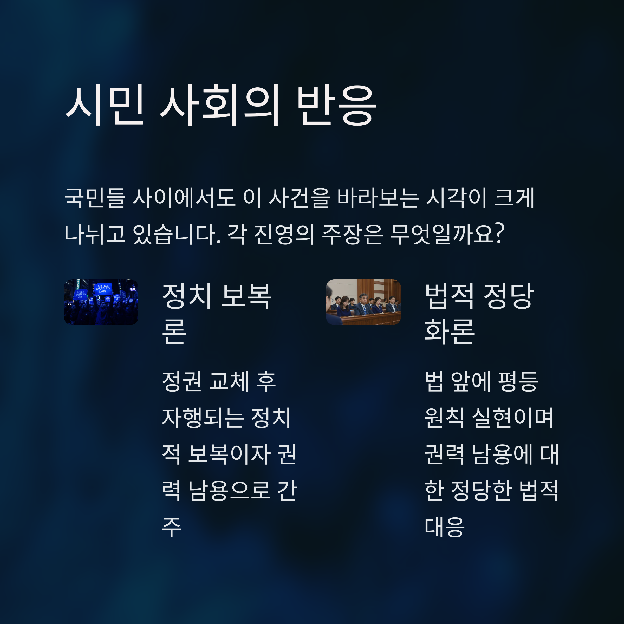 국민들 사이에서도 여러 목소리가 나오고 있습니다. 일부는 이번 사건이 정권 사이의 단순한 정치적 보복이 아니라 수십 년간 누적된 권력의 남용을 바로 잡을 결정적 기회라고 말합니다. 그러나 다른 일부는 법치를 떠나 감정적 정치 공방에 불과하다는 입장입니다. 이 글에서는 이 사건의 배경과 함께 법적·정치적·사회적 차원에서의 쟁점들을 명확히 분석하여 제공하고자 합니다.