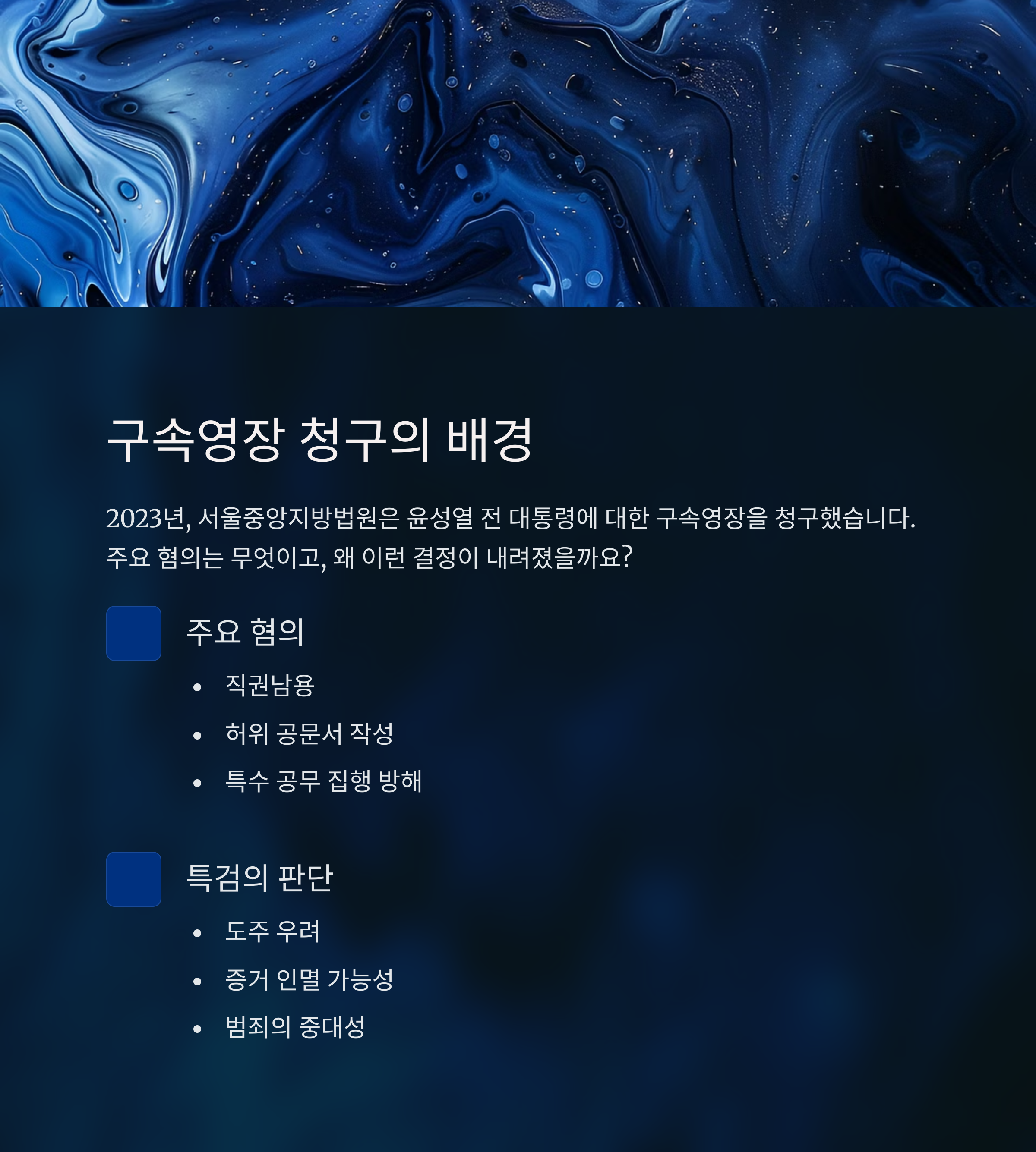 1. 구속영장 청구 주요 혐의는 직권남용, 허위 공문서 작성, 특수 공무 집행 방해로 구성되었습니다.
