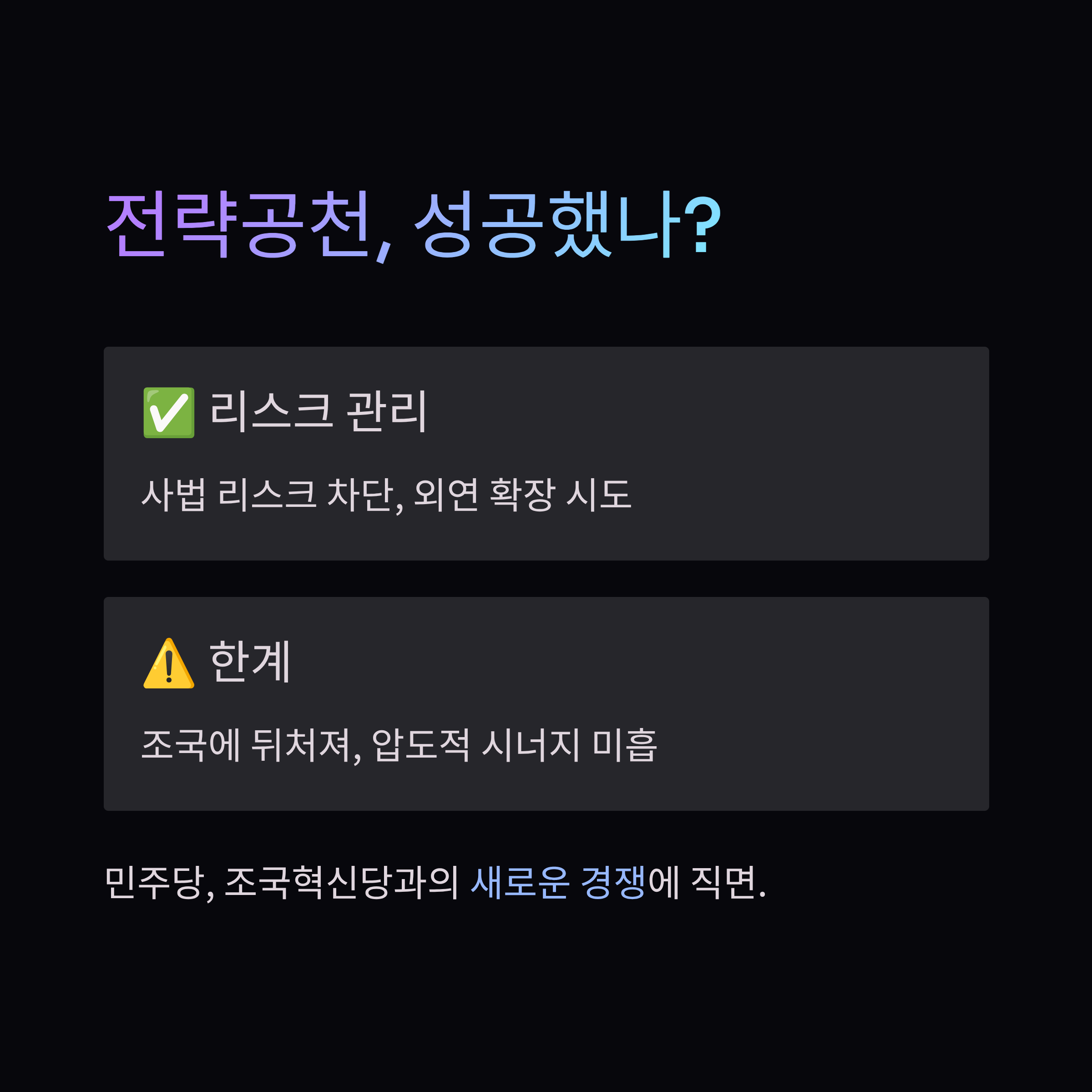김용남 후보를 공천한 것은 보수 성향 유권자들의 표심을 일부 흡수하려는 의도가 담긴 것으로 해석됩니다. 국민의힘에서 활동했던 이력을 가진 후보를 통해 외연을 확장하려는 시도입니다. 그러나 이 선택이 반드시 성공을 보장하는 것은 아닙니다. 기존 민주당 지지층 일부의 반발을 살 수 있으며, 여론조사에서 김용남 후보가 조국 대표에게 뒤처지는 결과가 나온 것은 민주당의 전략공천이 아직까지는 압도적인 시너지 효과를 내지 못하고 있음을 보여줍니다. 결국 민주당은 '리스크 관리'를 택했지만, 여전히 조국혁신당과의 경쟁이라는 새로운 과제에 직면한 셈입니다.