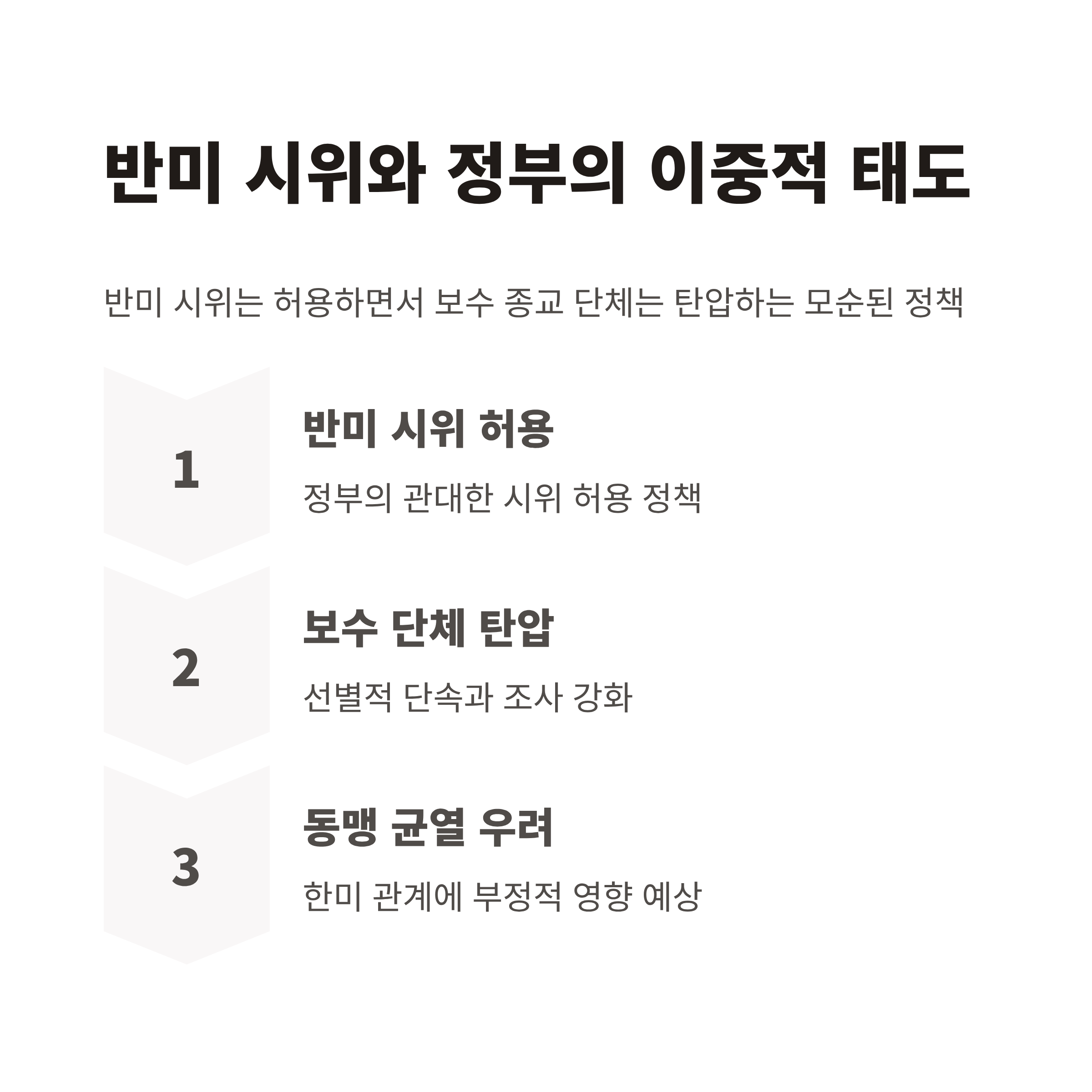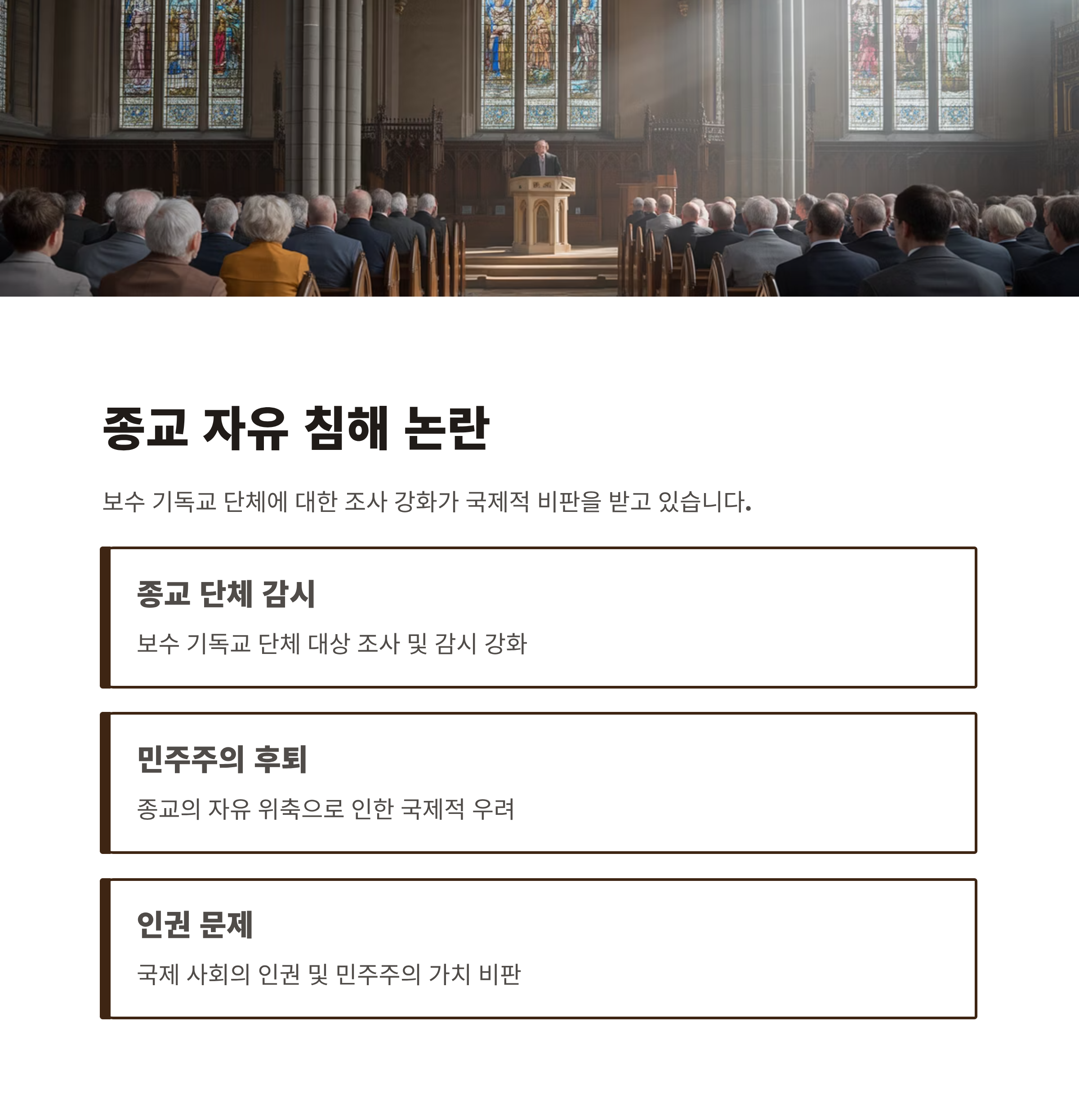 종교적 자유는 한국 사회에서 민감하고 중요한 문제로, 이는 정치와 매우 밀접하게 연결된 사안입니다. 특히 한미 관계에서 민주주의와 인권이 주요 논의 주제로 부각된 상황에서, 종교 탄압이나 반미 시위와 관련된 의혹은 미국 정치권의 반발 또는 무역 협정 재검토 등 새로운 외교적 변수로 작용할 가능성이 큽니다.