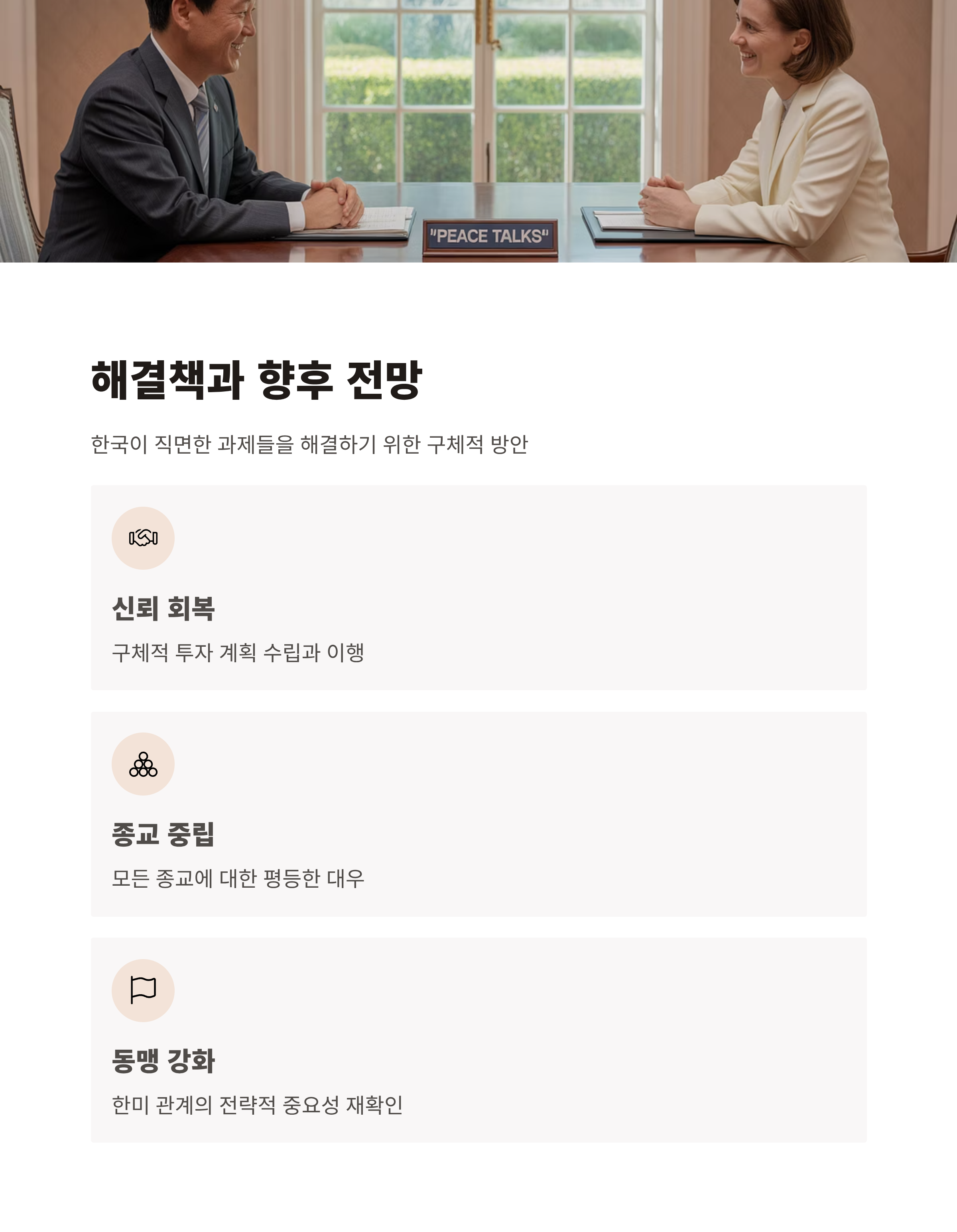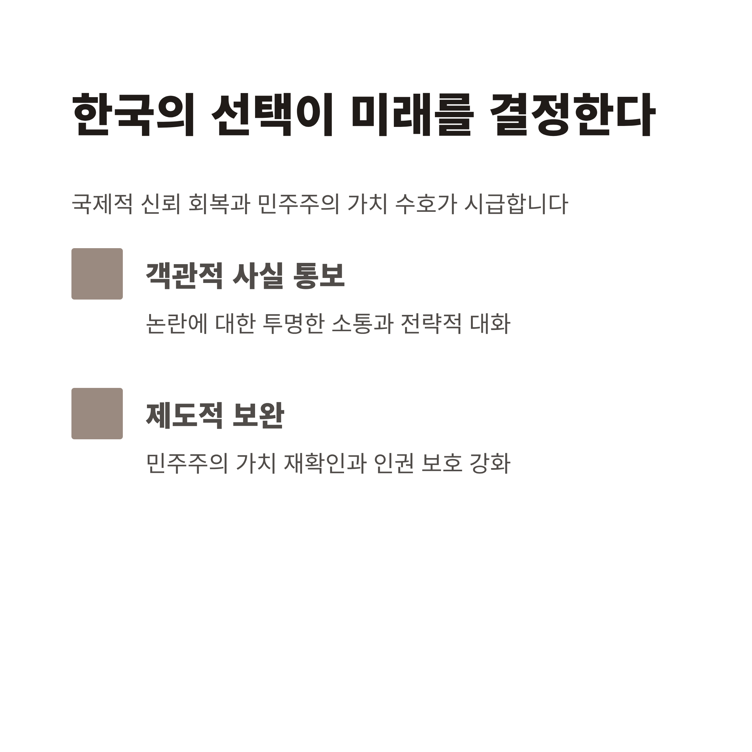 한국 정부는 신뢰 가능한 대외 정책을 통해 국제적 입지를 공고히 해야 하며, 특히 한미 동맹의 전략적 중요성을 감안하여 정책 방향을 설정할 필요가 있습니다. 또한 국내 민주주의 가치를 재확인하며, 인권 및 국제 규범 준수에 대한 노력을 강화해야만 합니다.