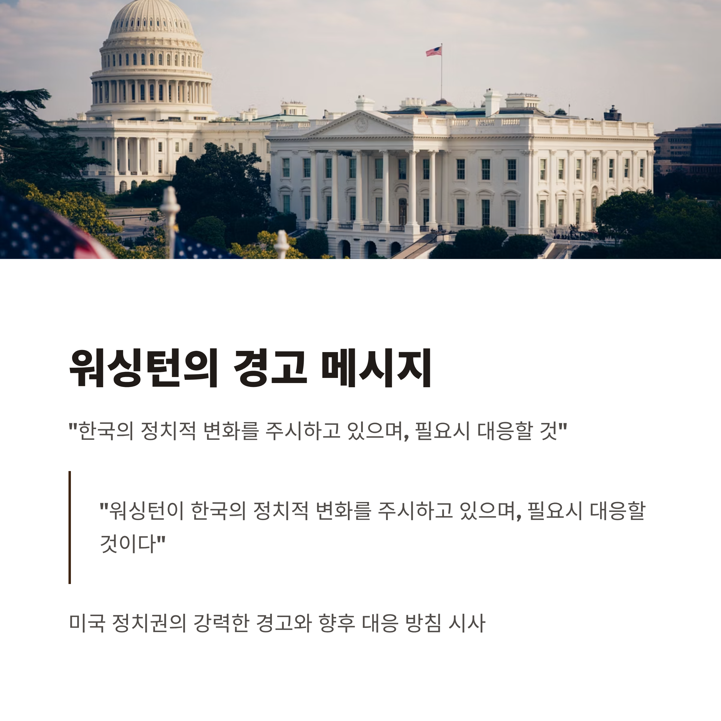 - 폭스 뉴스는 "워싱턴이 한국의 정치적 변화를 주시하고 있으며, 필요시 대응할 것"이라고 밝혔습니다.