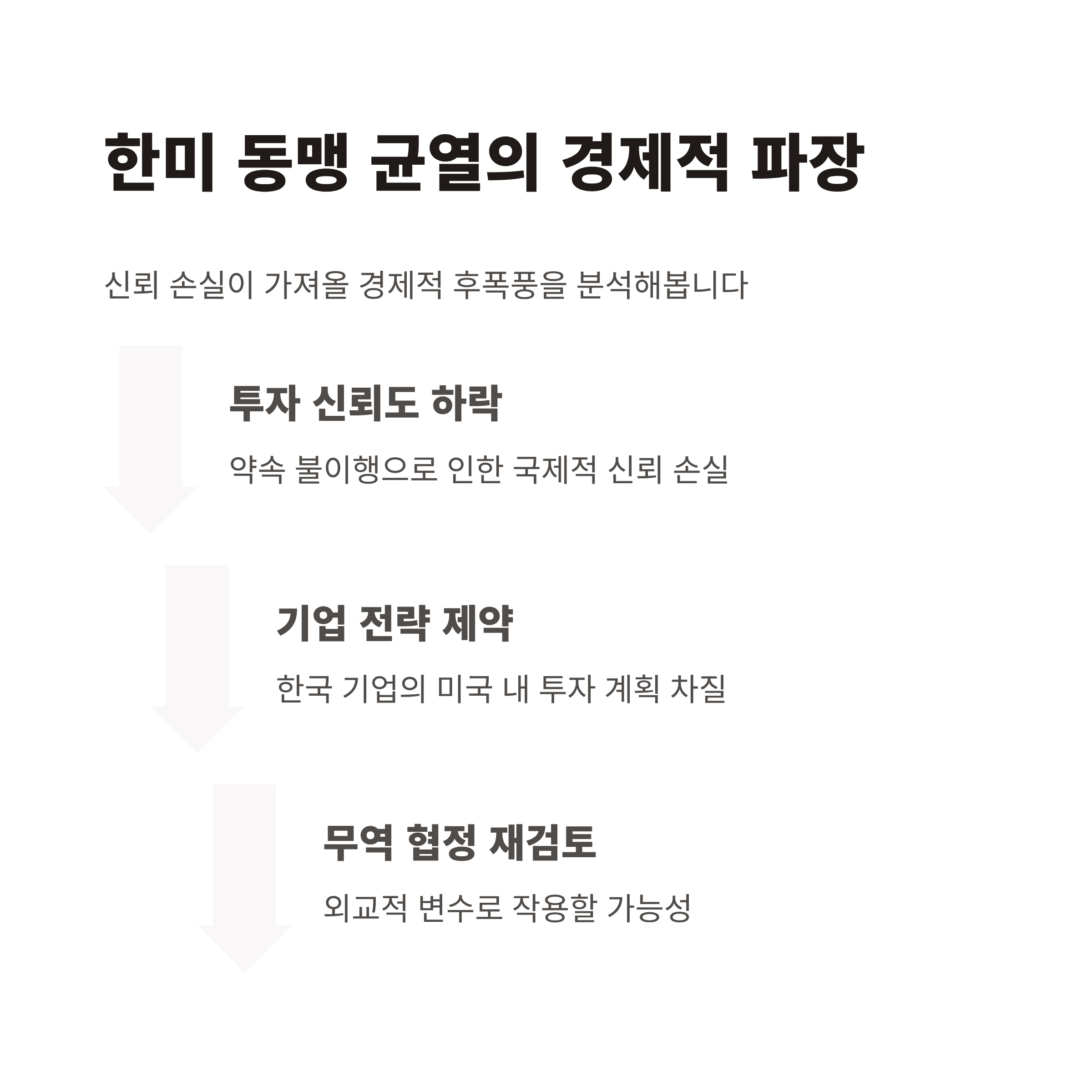 동맹국으로서의 균열은 단기적 정책 운영의 문제뿐만 아니라, 경제적, 군사적 협력에서의 장기적 신뢰 손실로 이어질 수 있습니다. 특히 기술·군사 협력과 같은 민감한 사안에서 불협화음을 키울 경우, 한반도 안보와 경제적인 안정성에도 부정적 영향을 미칠 가능성이 존재합니다.