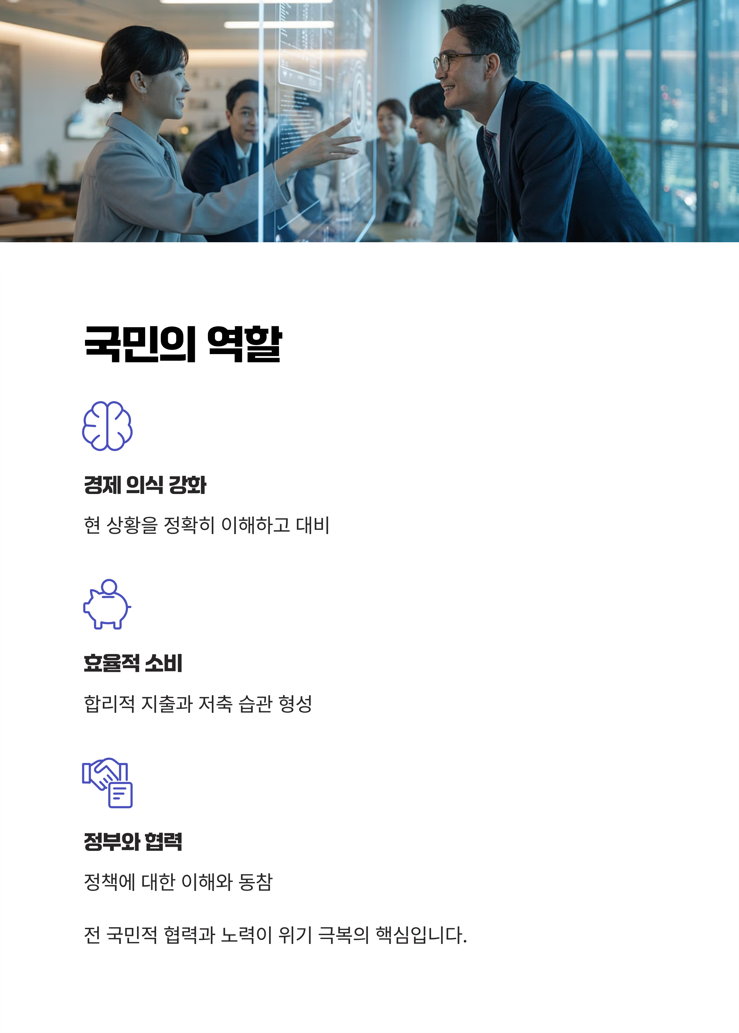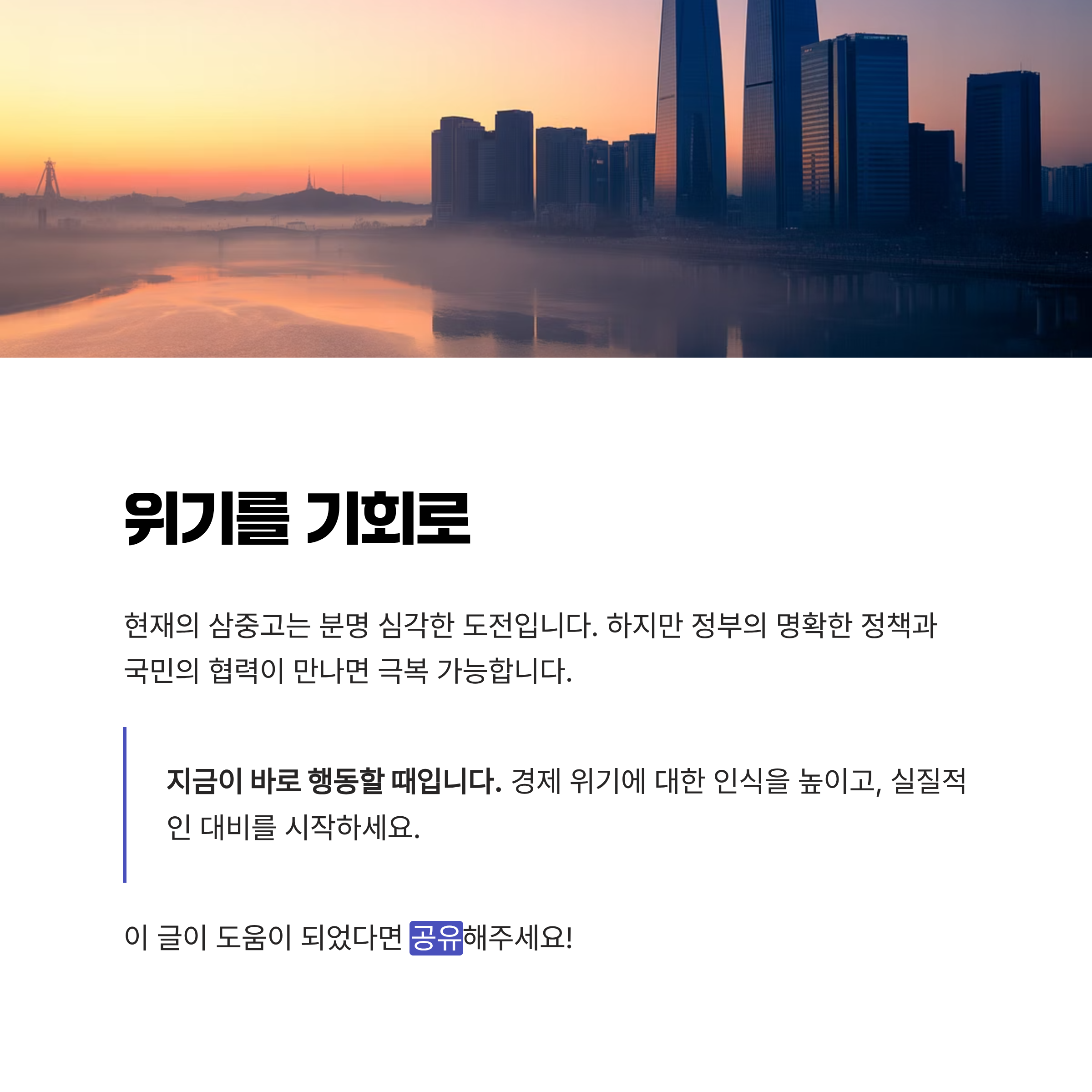 금리 정책, 외교적 협력 강화 및 기업 환경 지원 프로그램 등 다양한 방안이 필요하며, 국민들은 정부와 협력하여 경제적 인식을 높이고 효율적인 소비와 재테크를 통해 변화를 준비할 필요가 있습니다. 특히 다가올 추가적인 경제 충격에 대비해 전 국민적인 협력과 노력이 중요합니다. 현재 위기를 기회로 전환하기 위해서는 모두의 실질적인 노력이 절실한 시점입니다.
