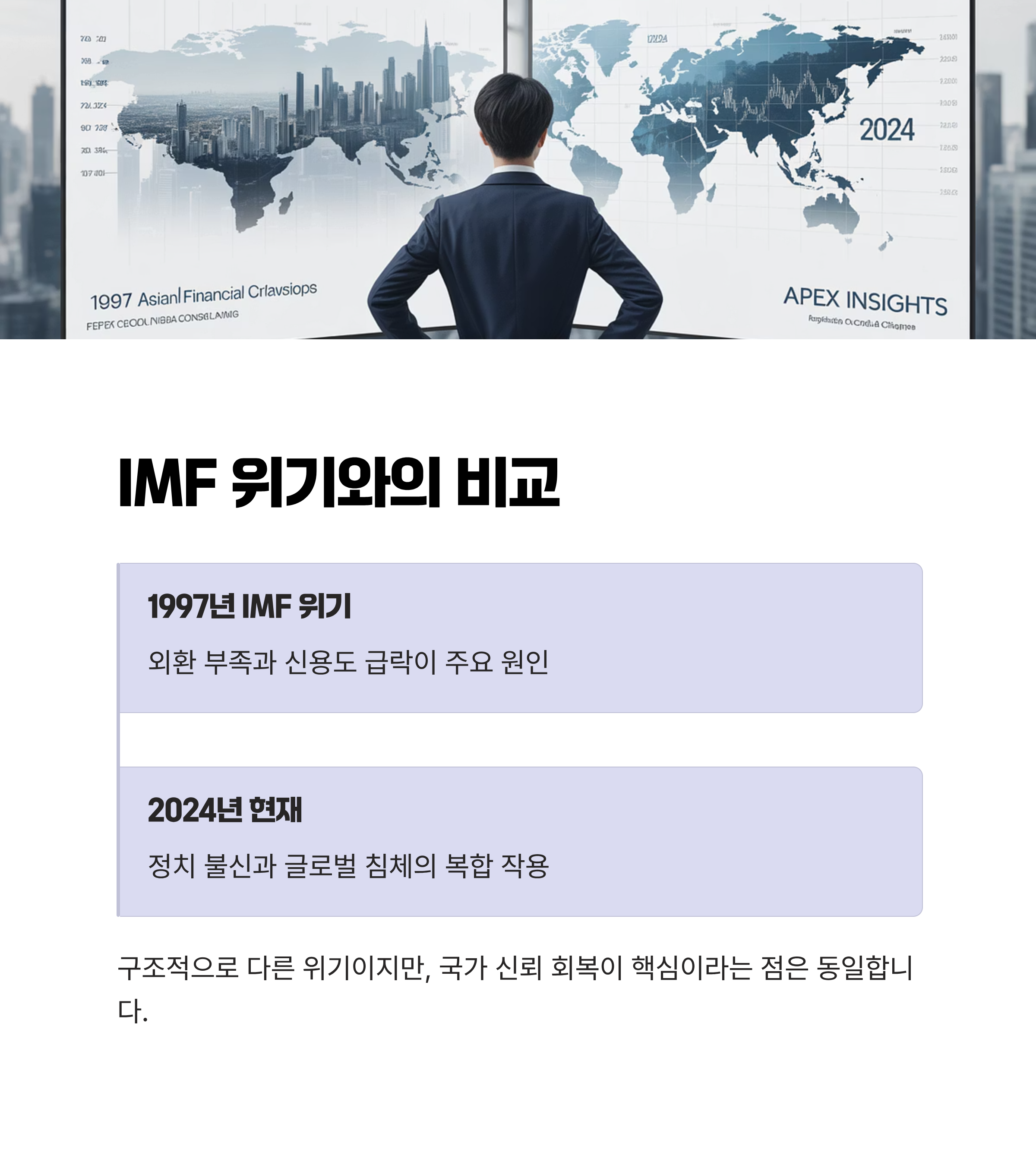 현재 위기는 IMF 외환위기와 구조적으로 다릅니다. 당시 위기는 외환 부족에 따른 신용도의 급격한 하락이었다면, 이번 위기는 정치적 불신과 글로벌 경제 침체가 맞물려 복잡한 방식으로 전개되고 있다는 점이 차이점입니다. |