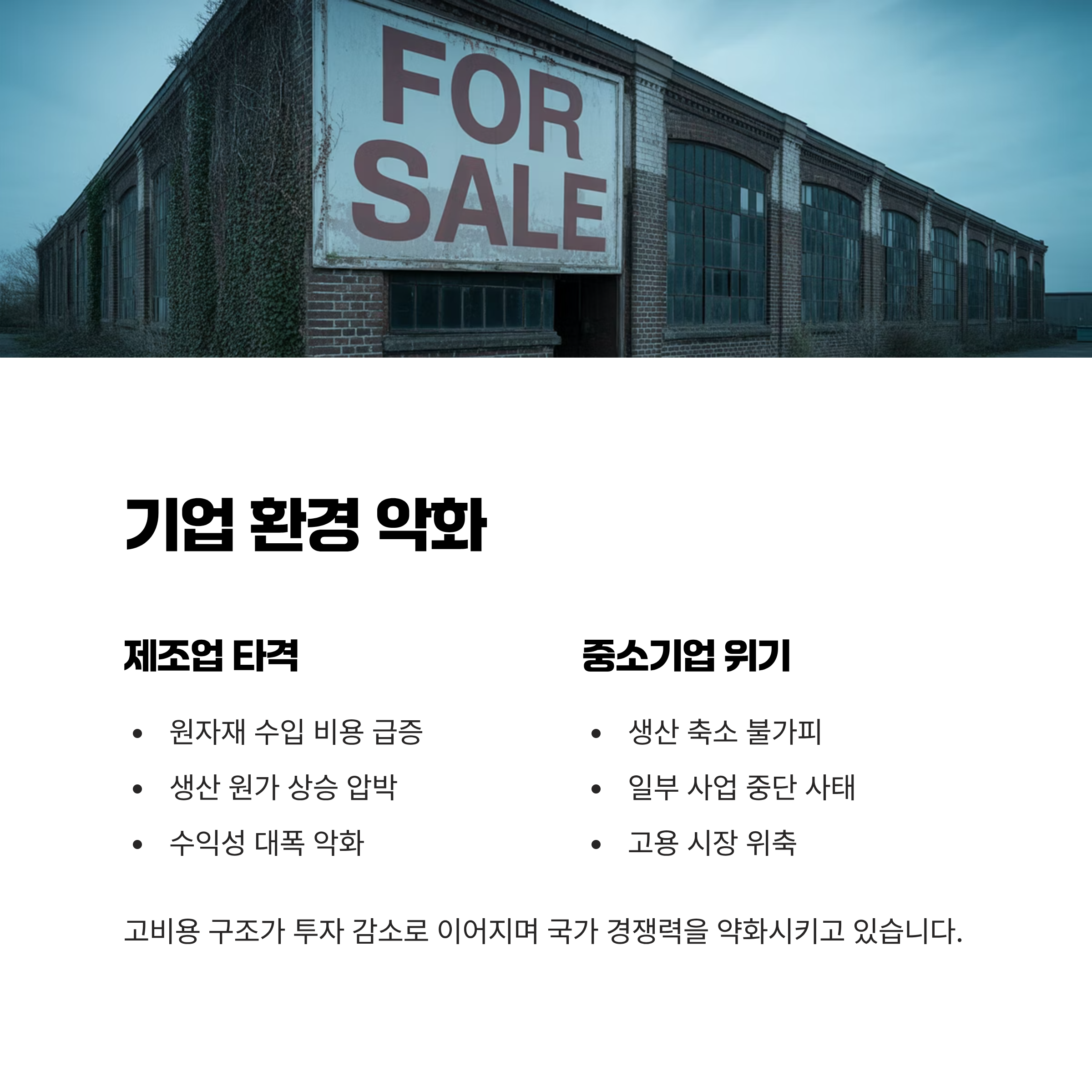 기업들 역시 원가 상승의 압박에서 벗어나기 어렵습니다. 특히 에너지와 원자재를 주로 수입에 의존하는 제조업과 중소기업들은 수익성이 크게 악화되고 있으며, 일부 기업은 생산을 축소하거나 사업을 중단해야 할 상황에 직면하고 있습니다. 이러한 고비용 구조는 투자 감소와 고용 시장 위축으로 연결되어, 장기적으로 국가 경쟁력을 약화시키는 결과를 초래할 수 있습니다.