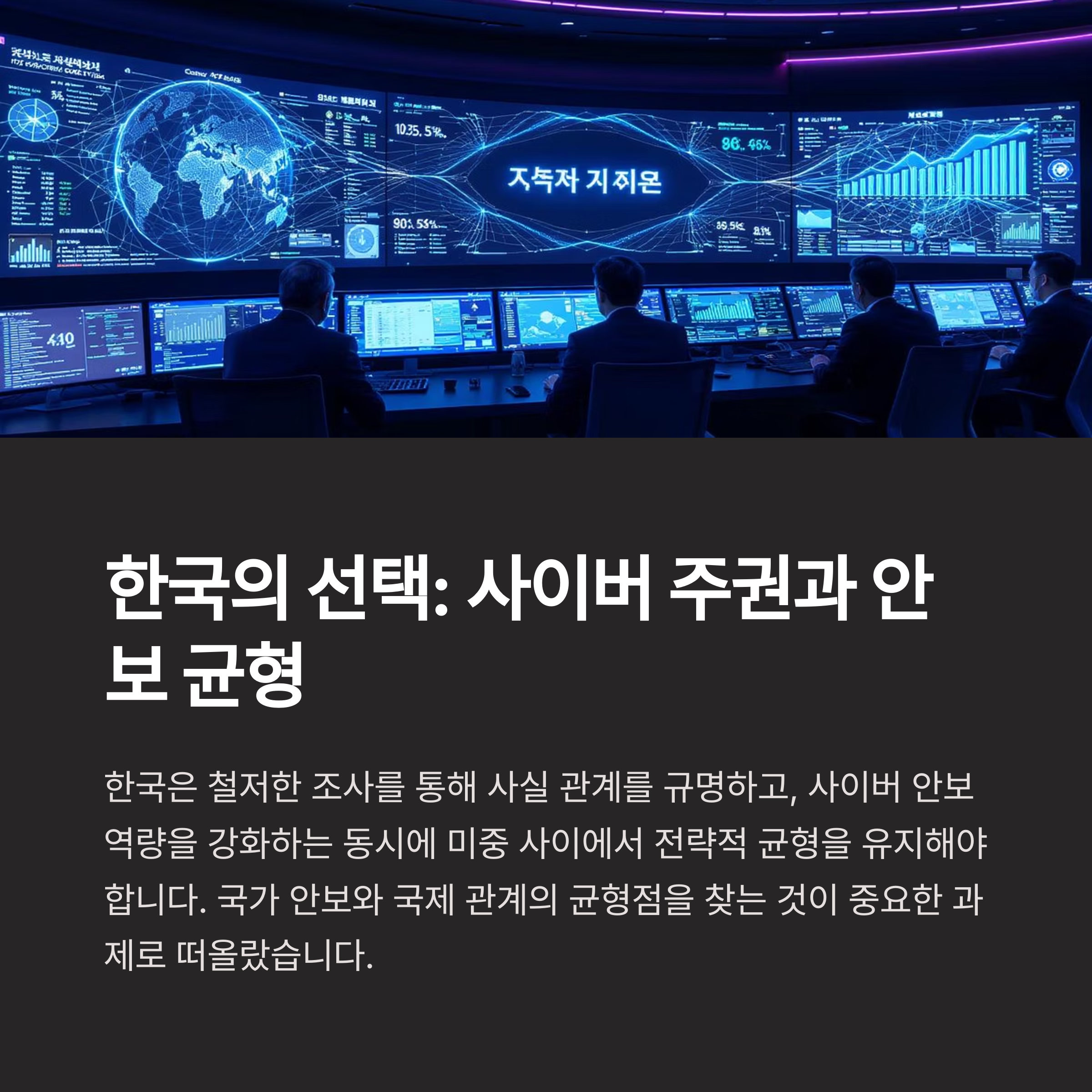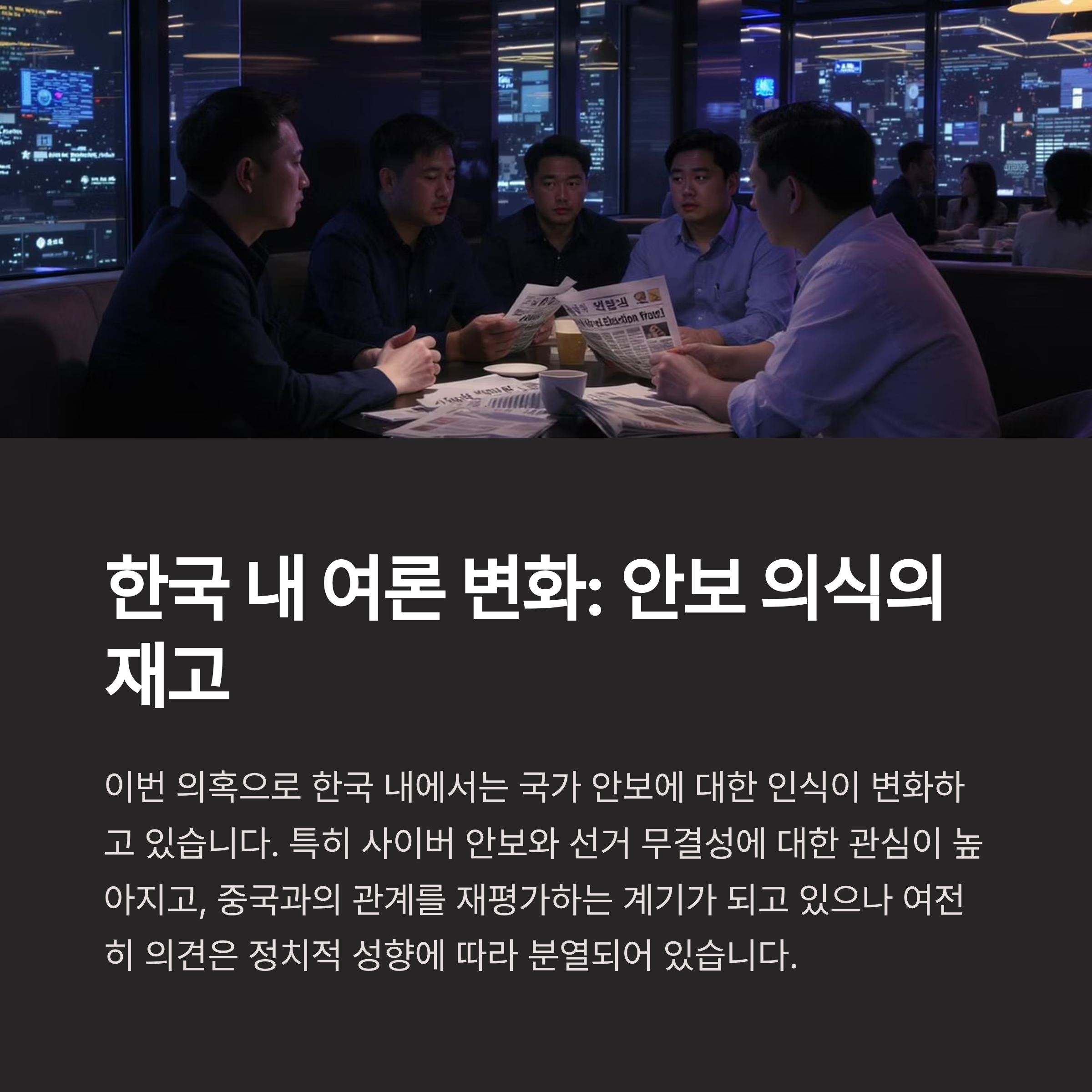 중국의 개입 여부가 명확히 입증된다면, 이는 한중 관계에 큰 파장을 미칠 뿐만 아니라, 사이버 보안과 민주적 가치 수호라는 측면에서 국제 사회의 강한 동맹 체제를 요구할 것입니다. 미국과 한국은 이에 발맞춰 구체적인 대응 전략을 수립하고 해당 문제를 더욱 철저히 조사해야 할 필요가 있습니다.