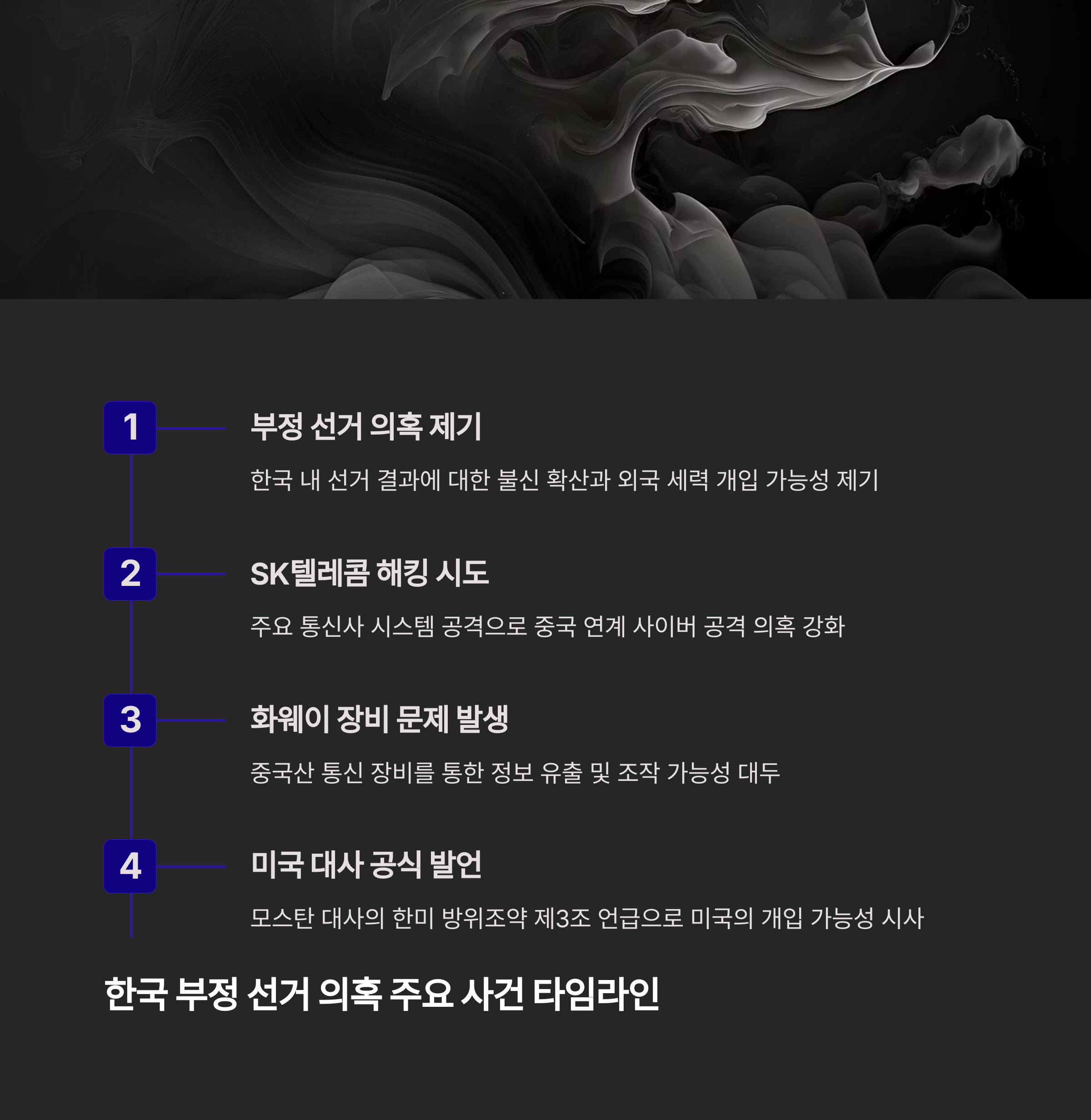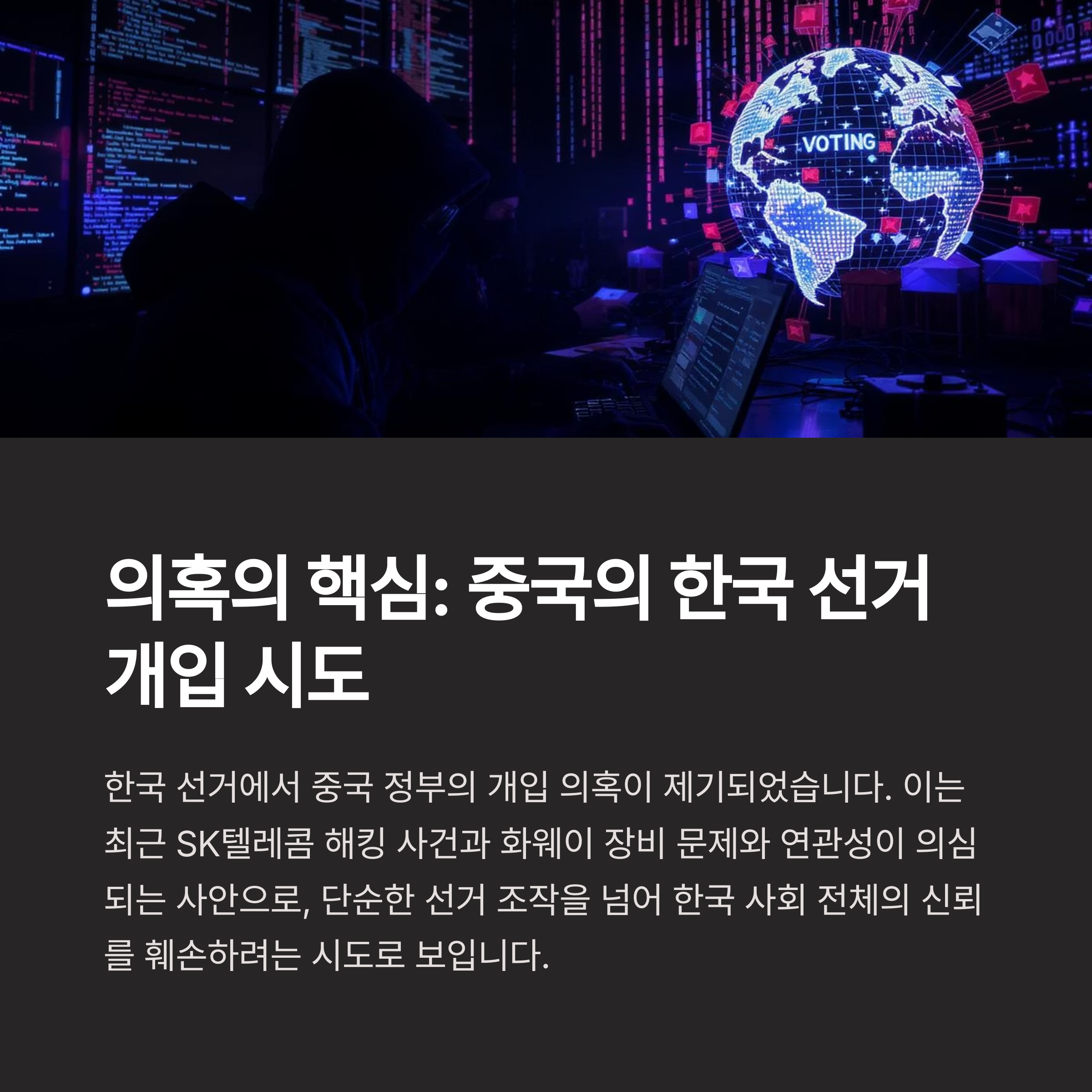 한국의 선거 과정에서 중국 정부의 개입 의혹이 제기되었고, 이는 최근 SK텔레콤 해킹 및 화웨이 장비 문제와 연관될 가능성을 보입니다.