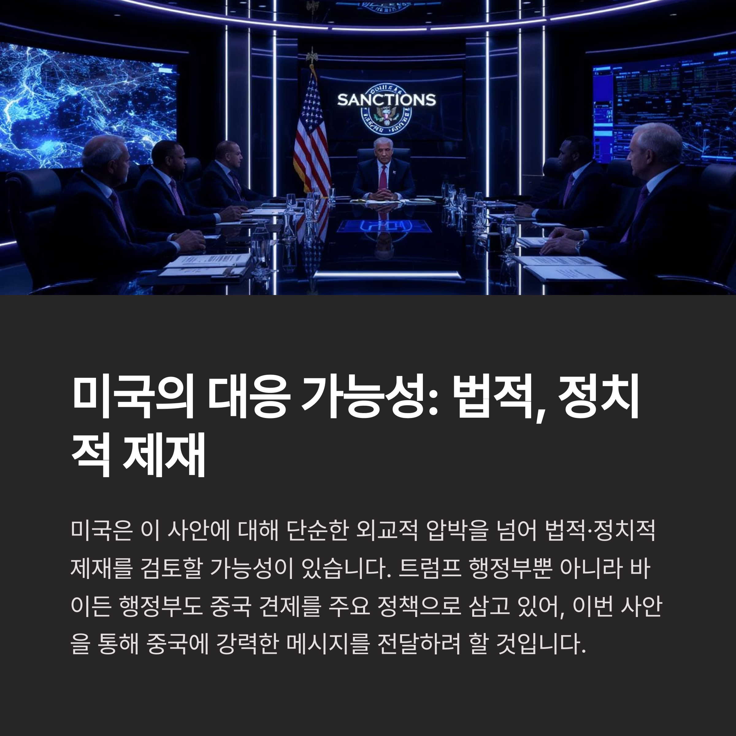 이에 따라, 미국은 단순한 외교적 압박을 넘어 법적 혹은 정치적 제재라는 조치를 취할 가능성도 배제할 수 없습니다. 이는 한국의 주권적 문제로만 한정되지 않고, 국제 사회 차원에서 중국의 영향력을 견제하는 전략적 행보로 작용하게 될 것이라는 전망이 나오고 있습니다.
