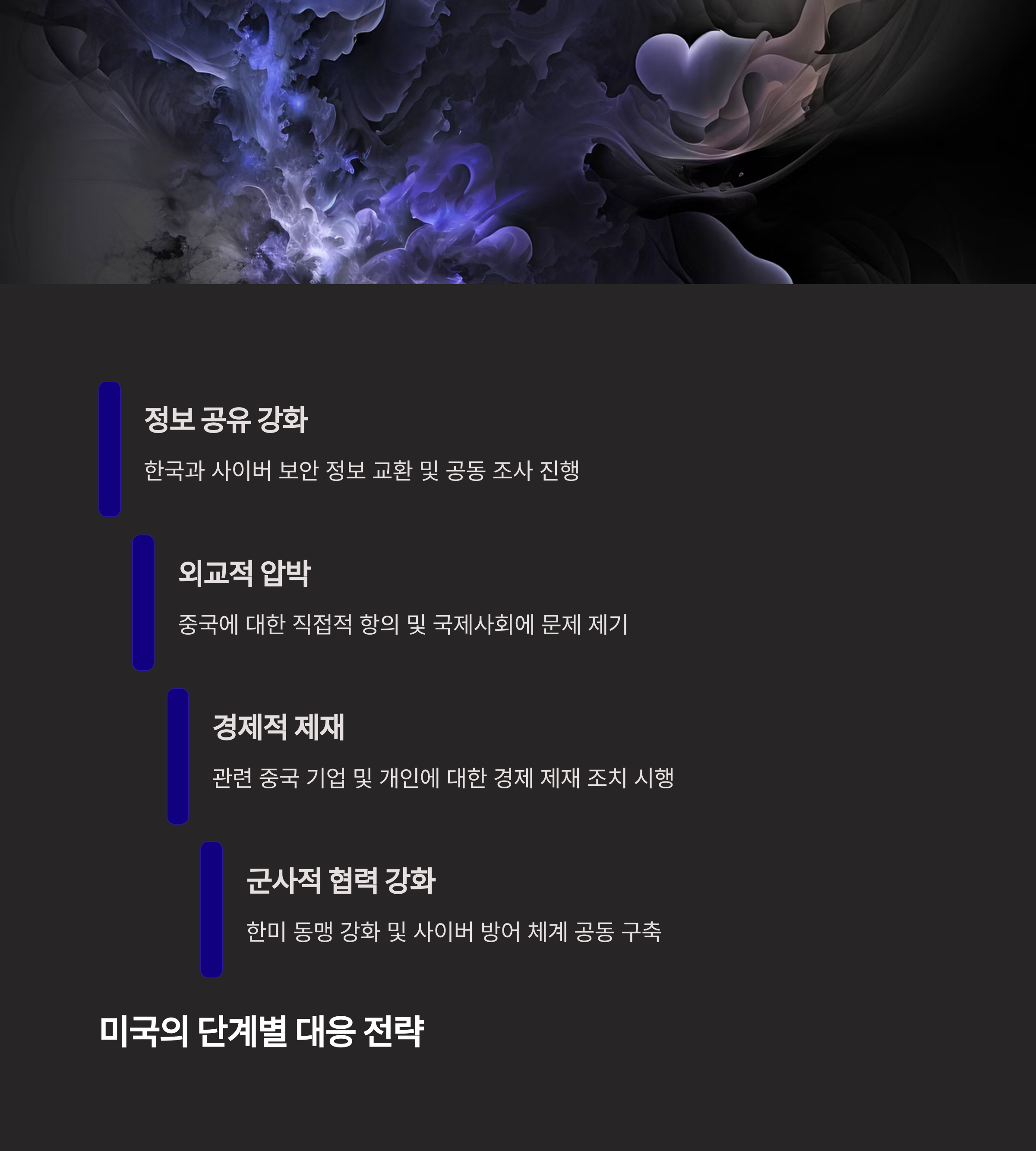 예를 들어, 미국은 이미 여러 차례 동맹국에 대한 사이버 위협 문제를 국제사회에 문제 제기한 바 있습니다. 이를 통해 한국이 미국과 협력하여 국제법 차원에서 중국의 개입 가능성을 규명하고 억제할 수 있는 가능성도 있습니다.