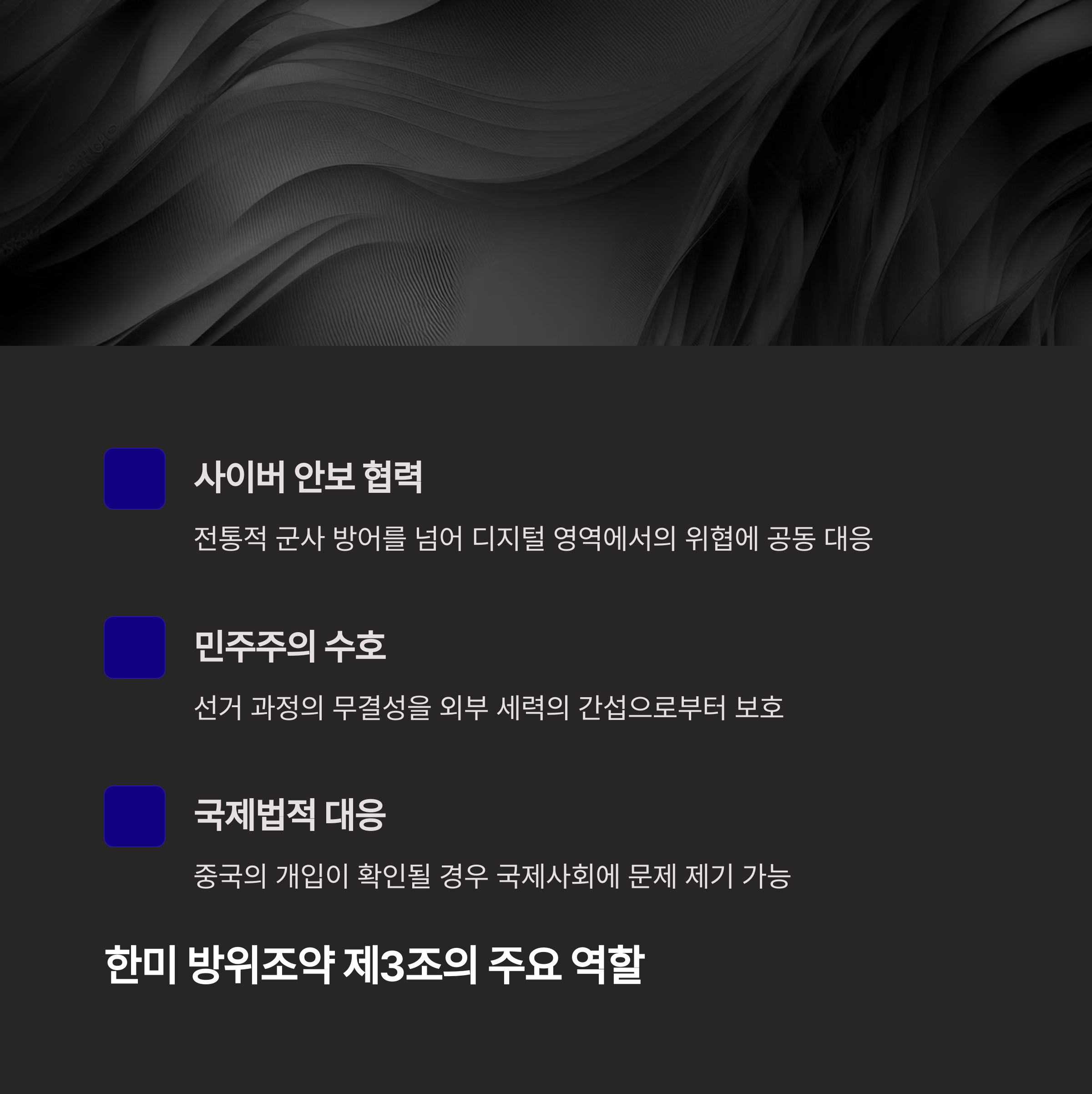 한미 방위조약 제3조는 사이버 위협과 같은 비전통적 안보 위협에 대해서도 양국이 공동 대응해야 할 책임을 규정하고 있습니다. 이는 이번 부정 선거 의혹 사태에서도 중요한 법적 근거가 될 수 있으며, 한국에 대한 중국의 사이버 공격이 발견될 경우 미국의 적극적인 개입을 정당화하는 역할을 합니다.
