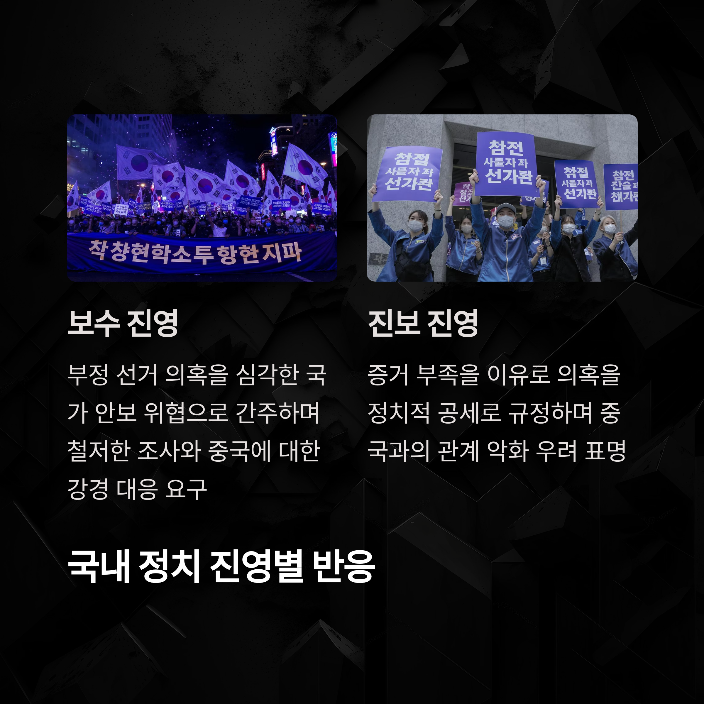 그러나 한국 내부에서는 실질적인 증거가 부족하다는 점을 들어 이를 일축하려는 목소리도 있으며, 더욱 철저한 조사가 필요하다는 여론도 있습니다. 이처럼 양국 간 관계는 중국의 영향력을 견제하려는 미국의 입장과도 결부되어 복잡하게 얽혀 있습니다.