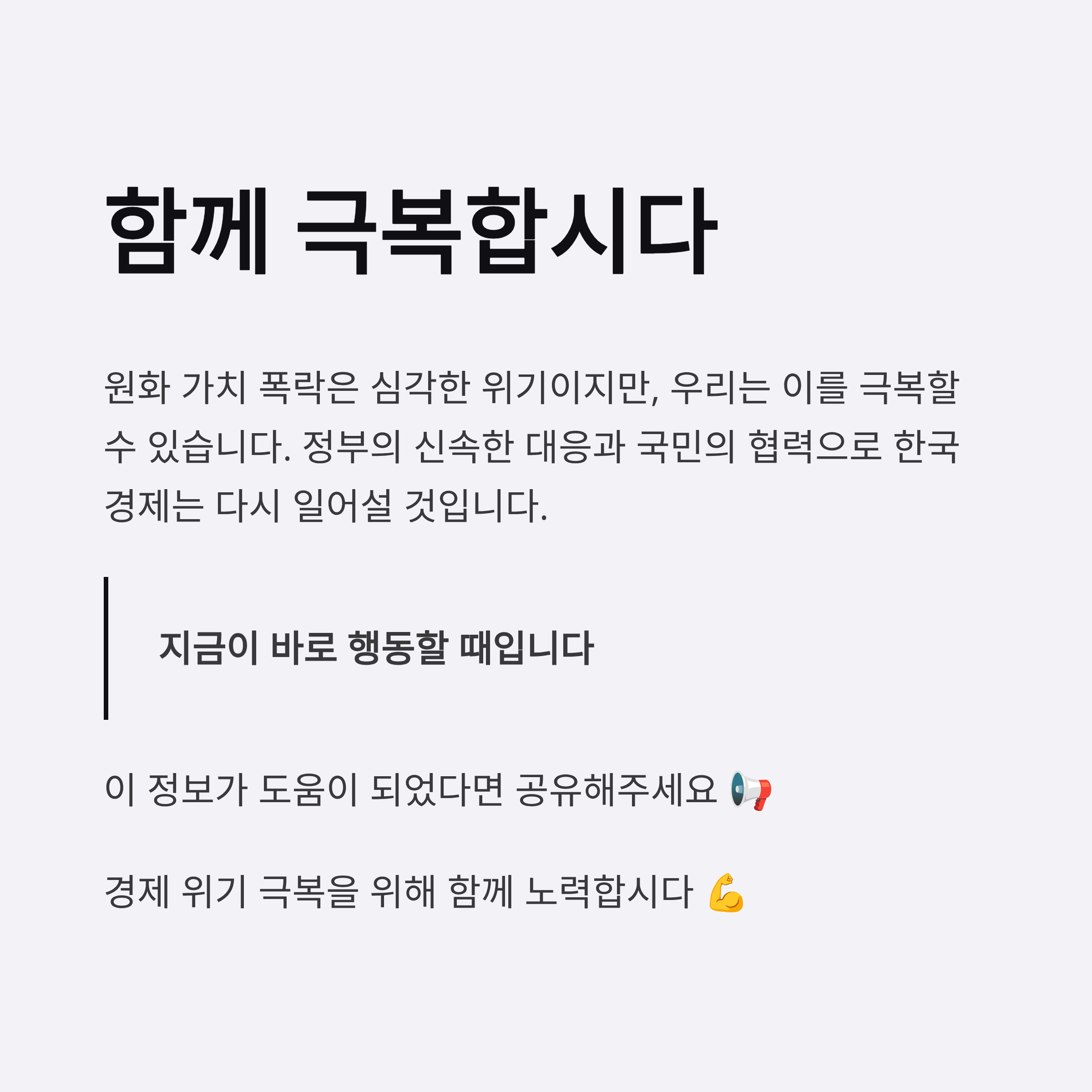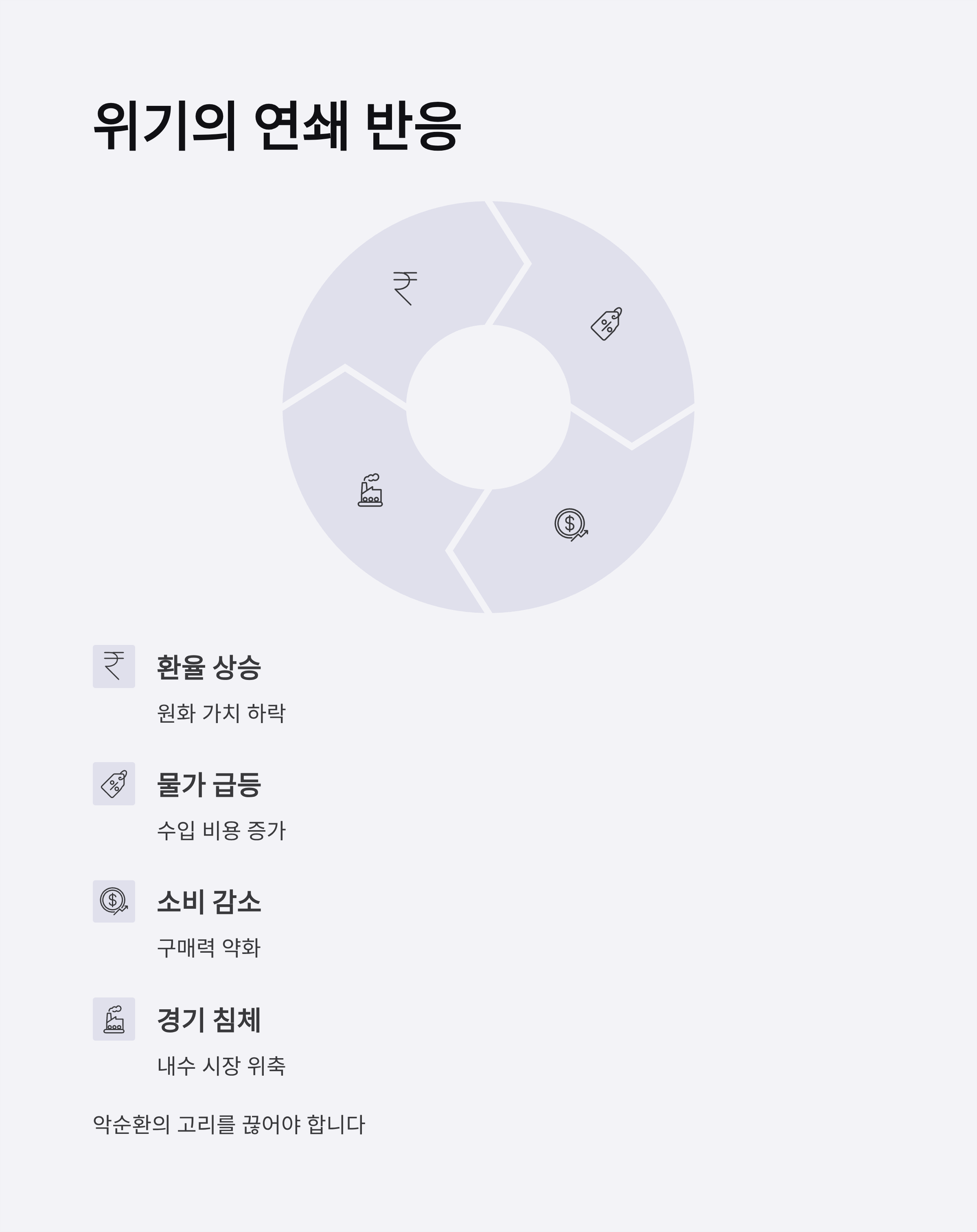 이를 극복하기 위해서는 정부와 한국은행이 다음과 같은 조치를 시행해야 합니다. 첫째, 금융 시장 안정화를 위한 환율 개입과 금리 조정을 신속히 진행해야 합니다. 둘째, 외환보유고 적정 수준 유지를 통해 글로벌 투자자 신뢰 회복에 나서야 합니다. 마지막으로, 수출 중심 경제 구조에서 벗어나 첨단 기술, 서비스 산업 강화와 같은 중장기적 경제 다각화 전략을 구축해야 합니다.