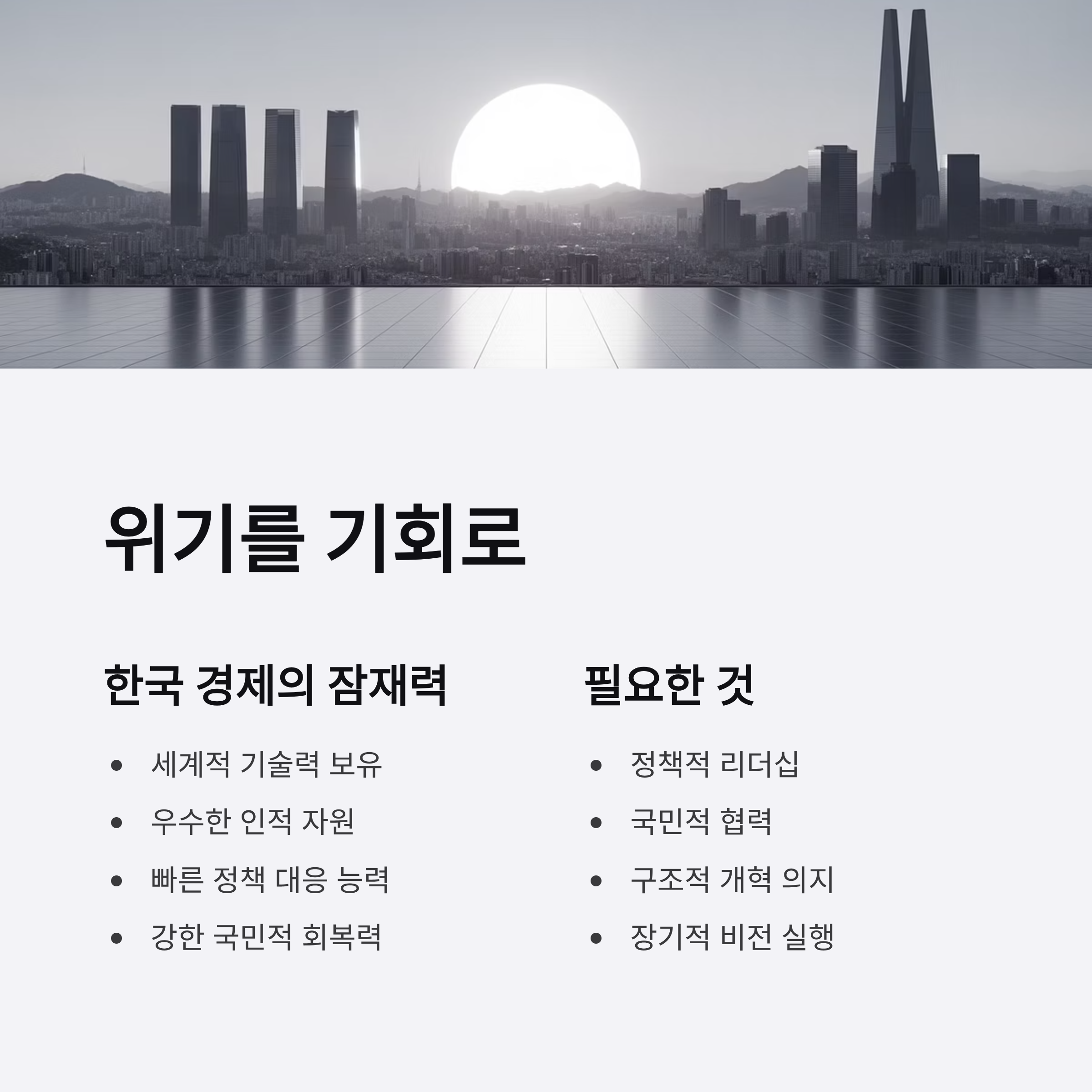 전방위적 경제 압박 속에서도 한국 경제는 위기를 기회로 전환할 잠재력을 지니고 있습니다. 국민적 협력과 정책적인 리더십 아래, 한국 경제가 글로벌 경제 속품에서 다시 한번 당당히 자리 잡을 수 있기를 기대합니다.