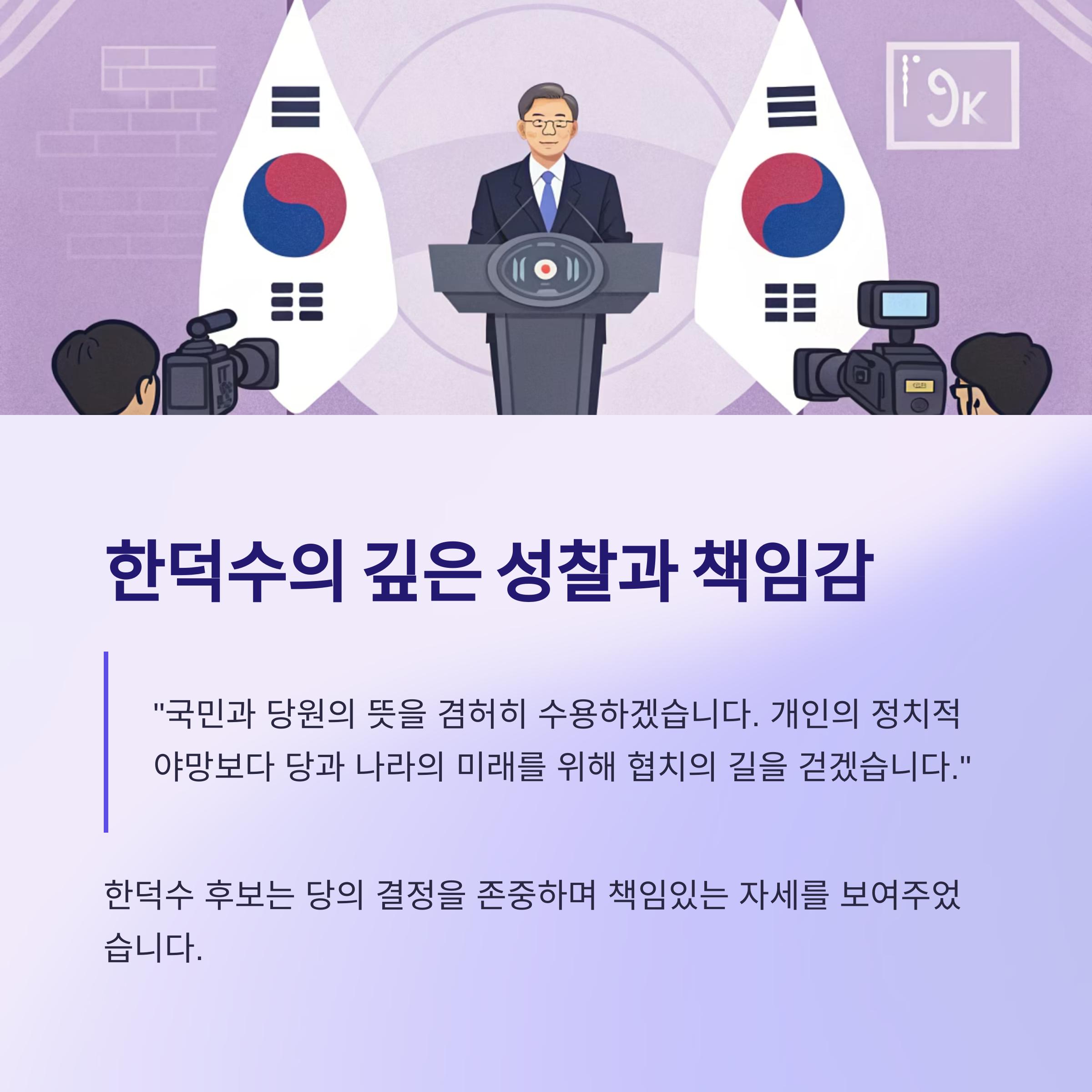 겸허히 국민과 당원의 뜻을 받아들이겠다는 한 후보의 발표는, ‘정면승부’보다 ‘책임과 통합’을 택한 보수 정치인의 전형을 보여주었다는 평가를 받습니다.