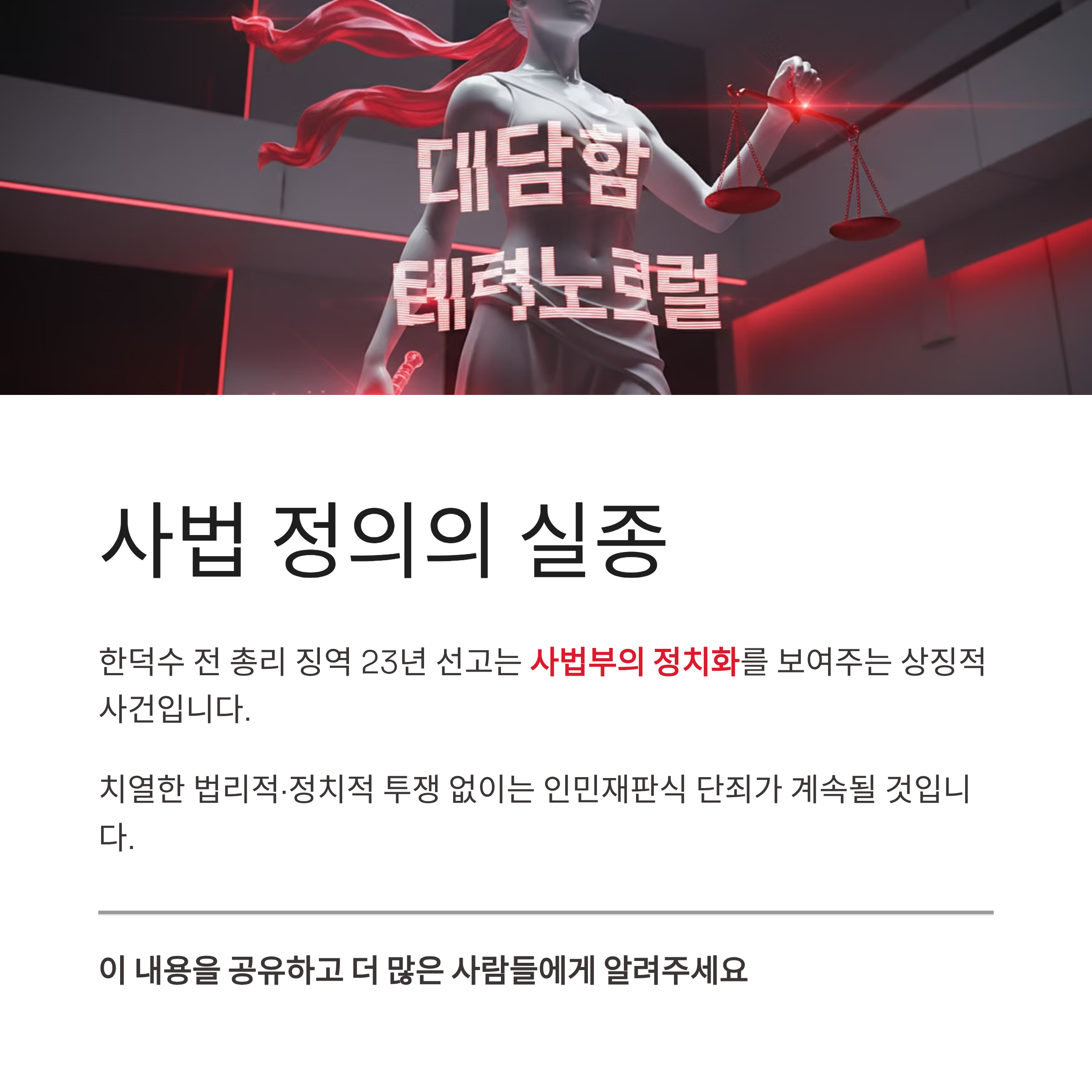 이번 한덕수 전 총리에 대한 징역 23년 선고는 대한민국 사법부가 정치 권력, 특히 현재의 거대 여당인 더불어민주당의 논리에 얼마나 깊이 종속되었는지를 보여주는 상징적인 사건입니다. 이진관 판사는 법률가의 양심보다는 진영 논리에 충실한 판결을 내렸다는 오명을 쓰게 되었으며, 이는 법치주의의 심각한 위기를 초래했습니다. 무엇보다 심각한 것은 이에 맞서 싸워야 할 국민의힘의 부재입니다. 부당한 정치 재판과 여론몰이 앞에서도 침묵하는 보수 야당의 태도는 결국 지지층의 실망과 보수 진영의 괴멸을 가속화할 것입니다. 한덕수 전 총리의 담담하지만 체념 섞인 수긍은 "싸우지 않으면 지킬 수 없다"는 냉혹한 현실을 우리에게 일깨워줍니다. 이제라도 부당한 판결에 대한 치열한 법리적, 정치적 투쟁이 동반되지 않는다면, 이러한 '인민재판'식 단죄는 계속될 것입니다.