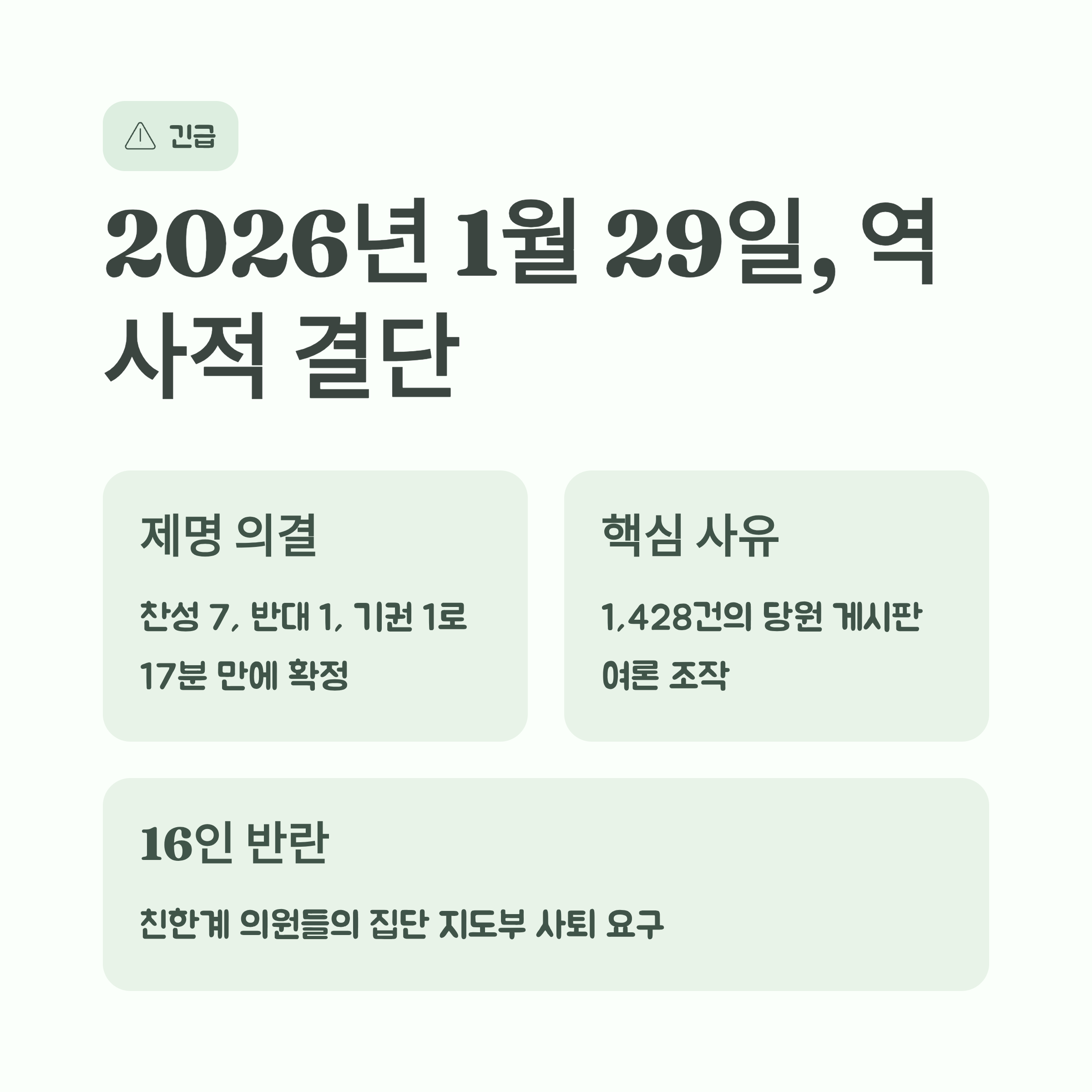 2026년 1월 29일, 국민의힘은 장동혁 대표 체제 하에 한동훈 전 위원장에 대한 제명을 최종 의결하며 역사적 결단을 내렸습니다. 이는 단순한 징계를 넘어, 보수 정당의 가치를 훼손하고 내부 분열을 조장한 '암세포'를 도려내는 외과적 수술이었습니다. 그러나 제명 직후 한동훈은 "반드시 돌아오겠다"며 불복을 선언했고, 그를 따르는 친한계 의원 16명은 집단으로 지도부 사퇴를 요구하며 '반란'에 나섰습니다. 이 글에서는 이번 사태의 핵심 트리거인 '당원 게시판 여론 조작 사건'의 실체를 파헤치고, 16인 반란의 진짜 이유를 데이터와 팩트를 기반으로 분석합니다.