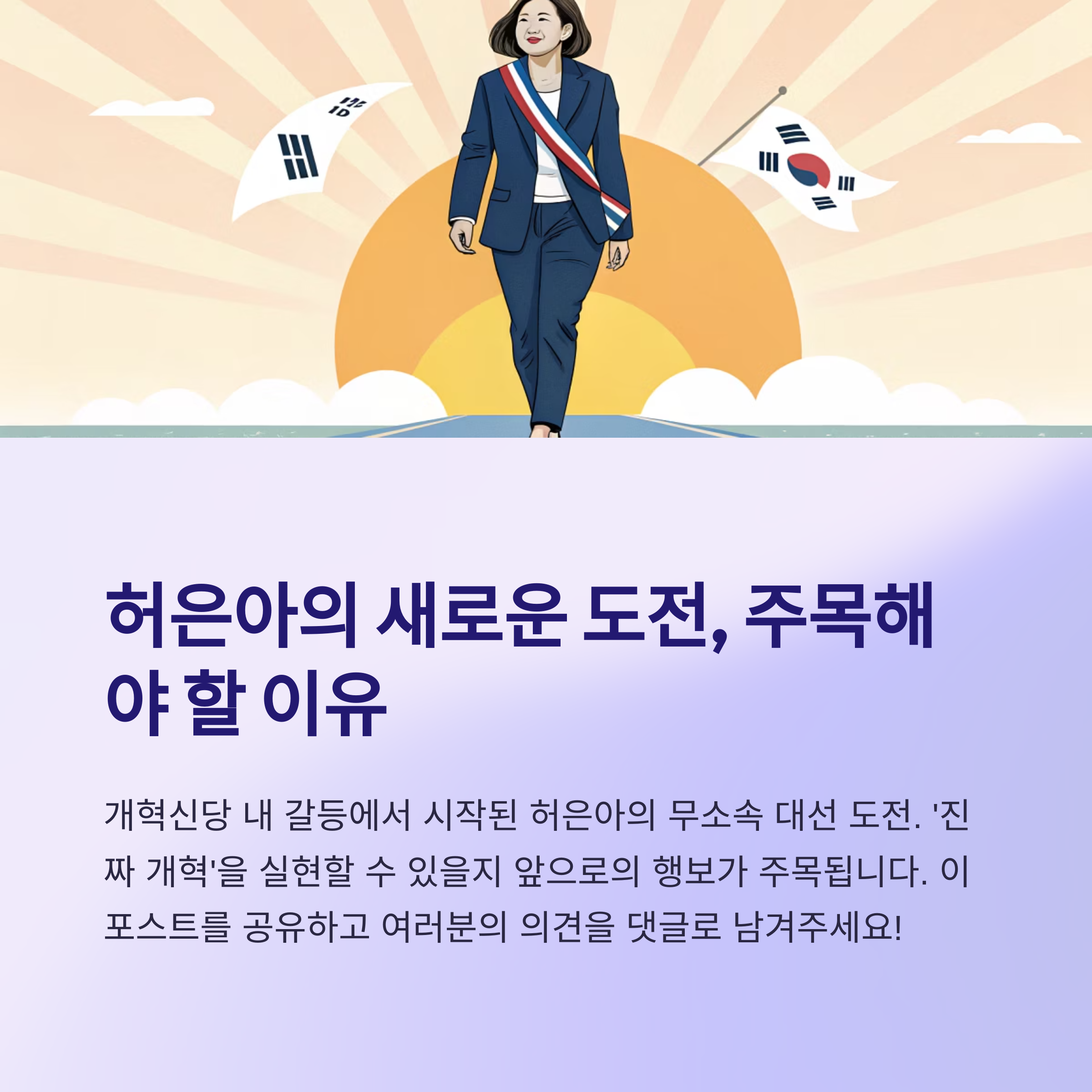 2025년 대한민국 정치에 중대한 영향을 미칠 사건이 발생했습니다. 허은아 전 개혁신당 대표가 무소속으로 제21대 대통령 선거 출마를 선언하며 정치계와 국민들에게 큰 화제를 낳고 있습니다. 특히, 기존 정당을 탈당하고 독립적인 길을 선택했다는 그녀의 결정은 정치계의 판도를 바꿀 가능성을 열어두고 있습니다. 이번 글에서는 그녀의 출마 배경과 정치적 의의, 선거 전략, 캠프 구성 및 관련 데이터를 종합적으로 살펴보며, 이 움직임이 한국 정치에 어떤 변화를 가져올 것인지 분석하겠습니다.